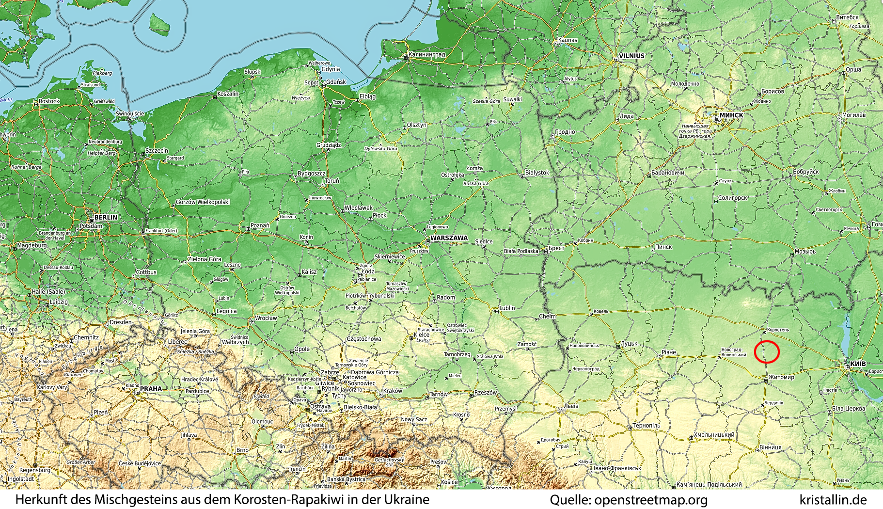 Dieses Gestein sieht aus wie Ångermanland-Syenitgabbro bzw. der Anorthosit von Höggrund, stammt jedoch aus dem Norden der Ukraine und wird in der Nähe von Lukoveckoe (nördlich von Shitomir) im Steinbruch abgebaut.