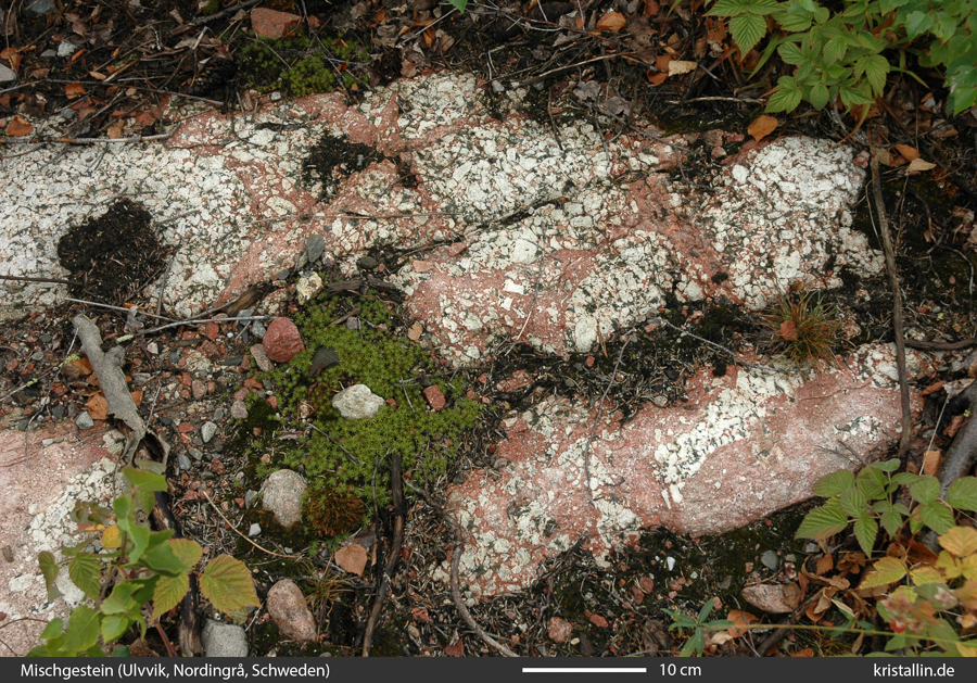 (18/27) Hier löste die rote granitische Schmelze den Anorthosit auf und zerlegte ihn in einzelne Kristalle.