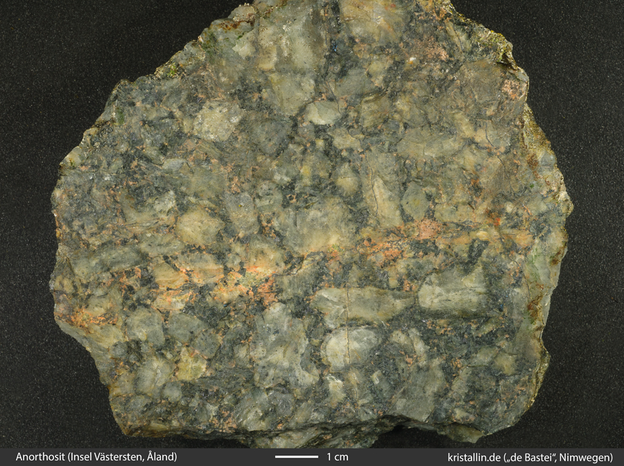 (23/27) Einzelstück des Anorthosits von der Insel Västersten (ebenfalls Åland) mit einer lokalen rötlichen Verfärbung.
