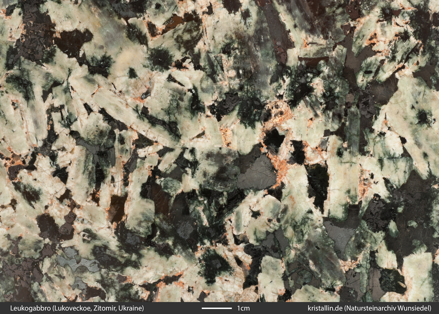 (25/27) Hier gibt es zwar etwas mehr dunkle Minerale, aber ansonsten ist auch das ein Mischgestein vom Typ „Ångermanland-Syenitgabbro“ - allerdings aus der Ukraine. Dort wird es in der Nähe von Shitomir sogar im Steinbrauch abgebaut.