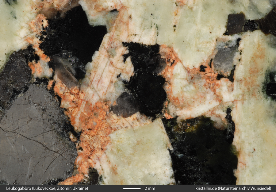 (26/27) Das ukrainische Gestein aus der Nähe. Auch hier wieder große, blass grünliche Plagioklase mit einer rötliche Masse zwischen den Feldspäten. Die hat wiederum eine ungefähr granitische Zusammensetzung und enthält kleine Quarze mit graphischen Verwachsungen. In diesem Ausschnitt sind auch drei größer graue Quarze erkennbar.