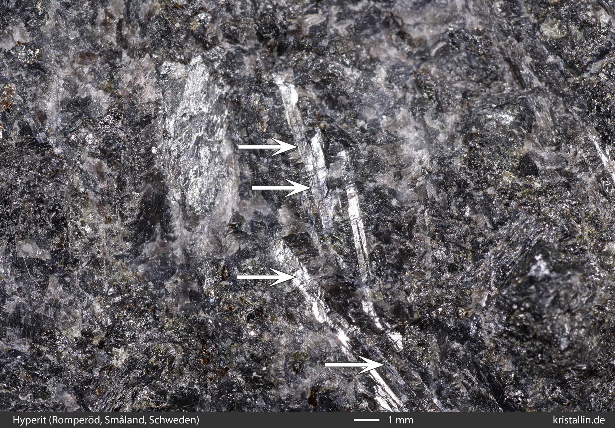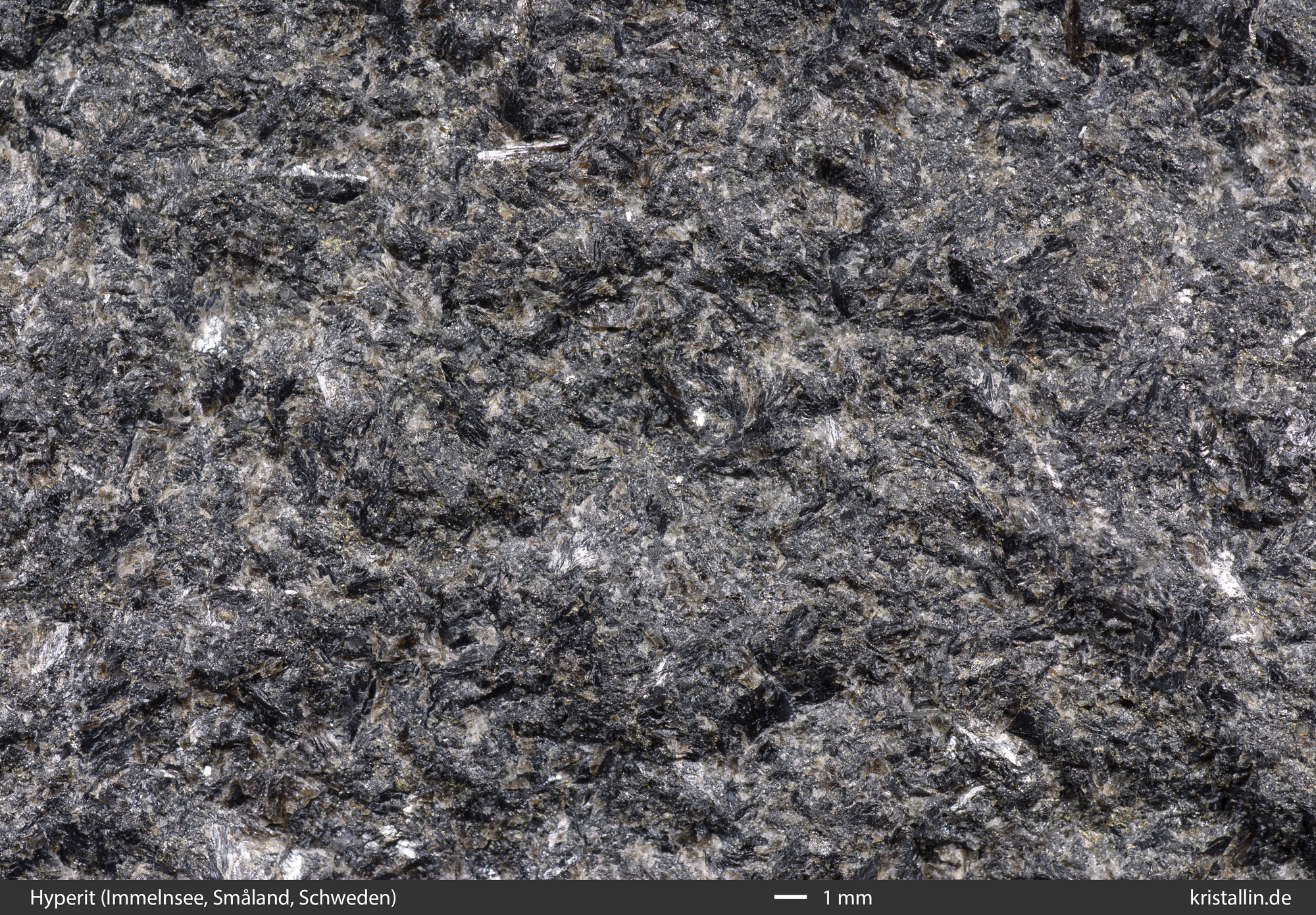 Die schlanken Plagioklase erkennt man nur bei guter Beleuchtung. Hätte der Feldspat eine so helle Farbe wie in anderen mafischen Gesteinen, dann wären die Hyperite voller kleiner weißer Nadeln. So ein Gefüge mit einzelnen größeren Plagioklasen in einer feinkörnigen Grundmasse nennt man „Dolerit“ (alte Bezeichnung „Diabas“). Da die Plagioklase hier aber sehr dunkel sind, kann man sie auf den ersten Blick kaum vom Pyroxen unterscheiden und deshalb wirken diese Gesteine massig und schwarz.