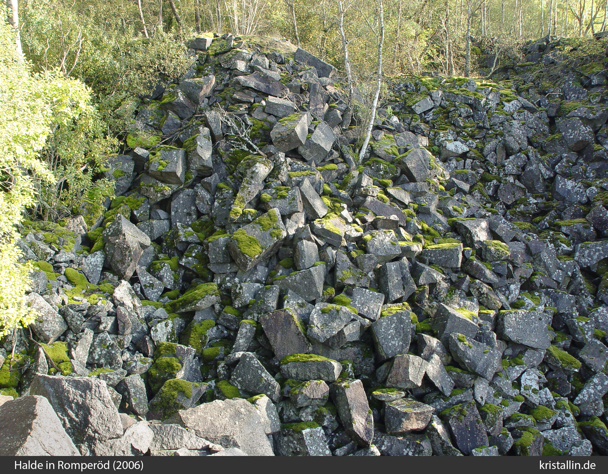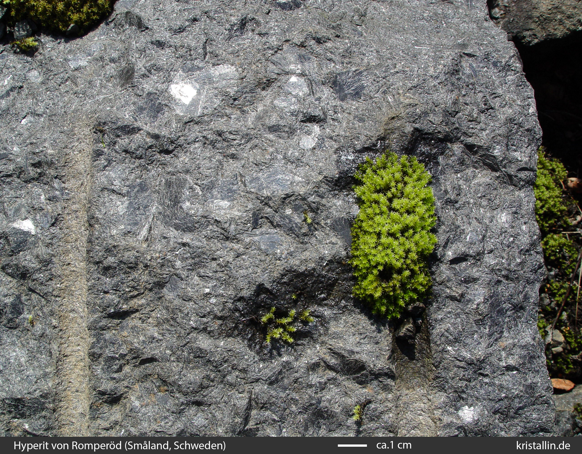 Some hyperites are coarse-grained with plagioclases of centimetre size. Such a hyperite was formerly mined at Romperöd in Småland. The area is now under protection, but the dump of the old quarry is still accessible.