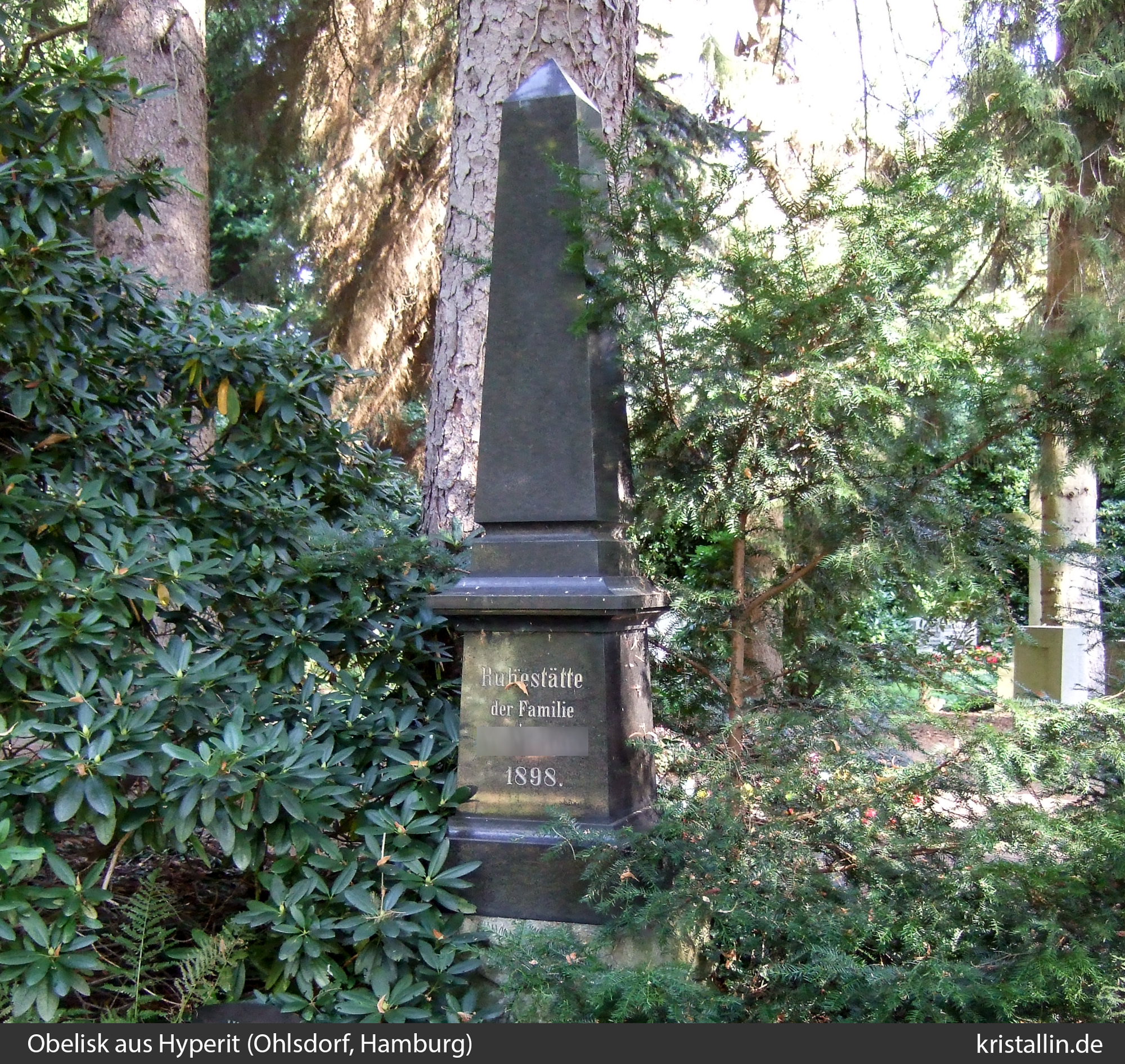 Es war vor allem die tiefschwarze Farbe, die den Hyperit begehrt machte. Ein großer Teil wurde als Grabsteine verwendet, die man noch heute auf unseren Friedhöfen findet. Die beiden folgenden Beispiele habe ich auf dem Ohlsdorfer Friedhof in Hamburg fotografiert.