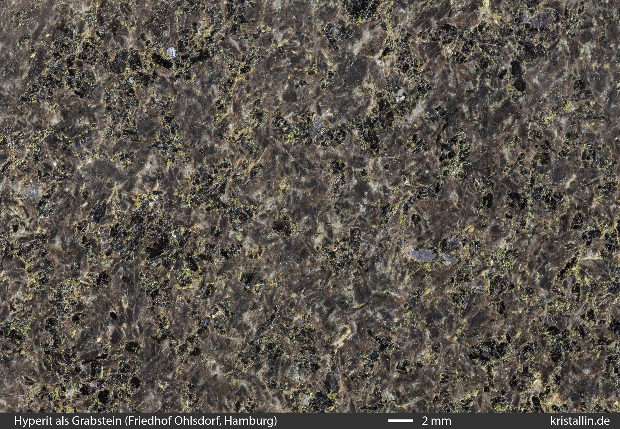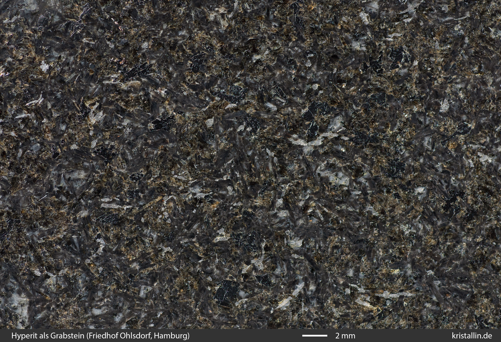 Allerdings gibt es Unterschiede in der Färbung. Manche Hyperite enthalten auch etwas hellen Plagioklas, was das Gestein dann dunkelgrau statt schwarz aussehen lässt: