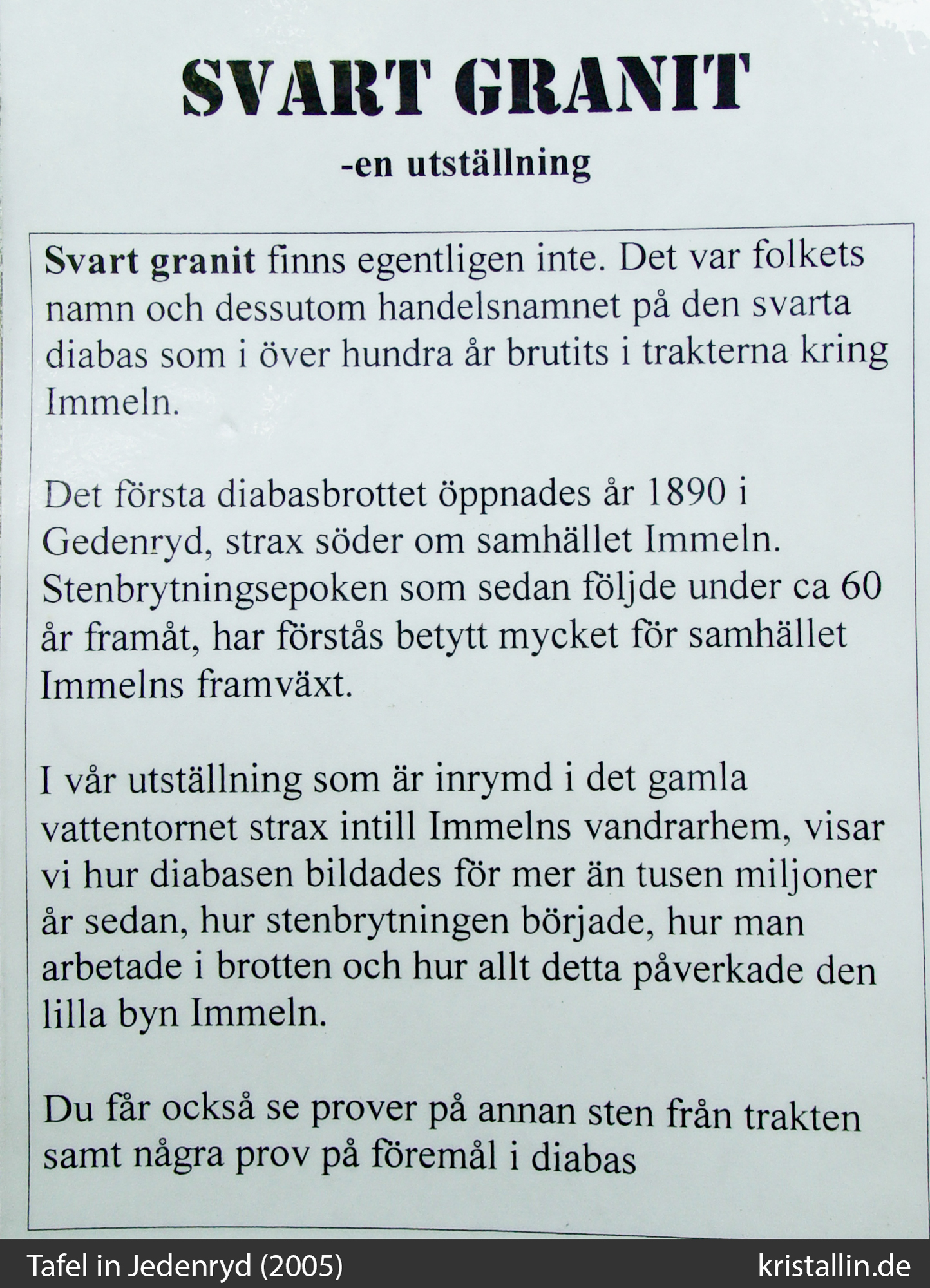 Der erste Diabas-Steinbruch wurde im Jahre 1890 in Gedenryd, gleich südlich des Ortes Immeln eröffnet. Die Epoche des Gesteinsabbaus, die dann über 60 Jahre folgte, hat verständlicherweise viel für das Wachstum und die Weiterentwicklung des Ortes Immeln bedeutet.