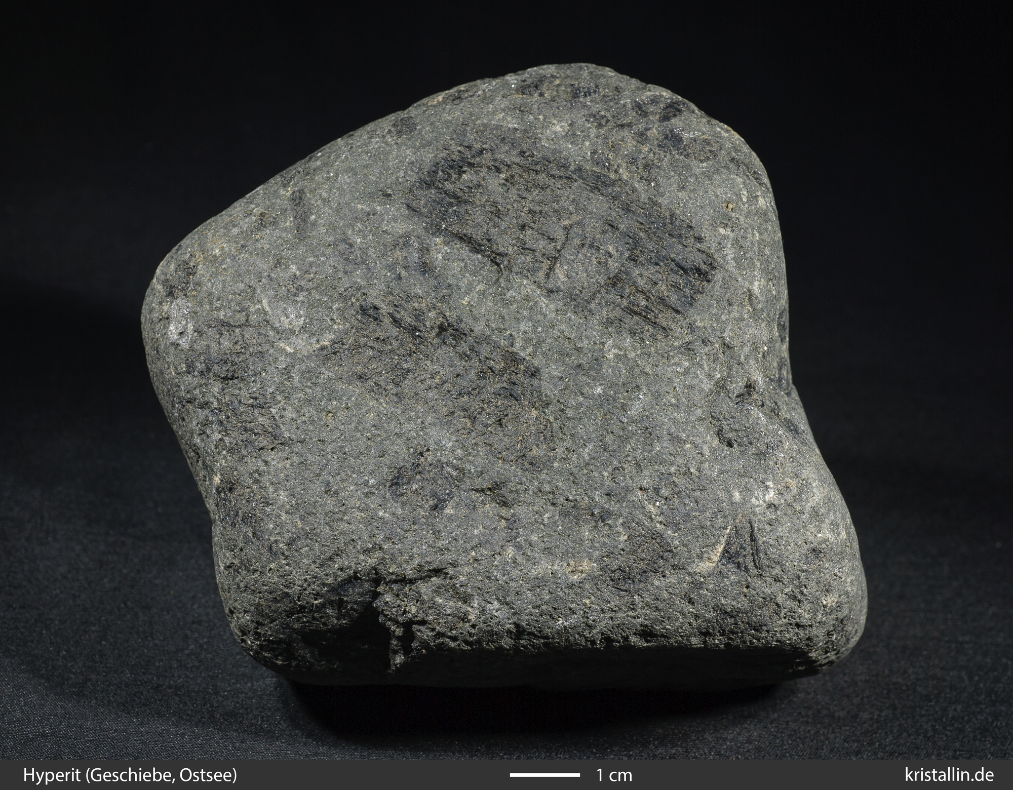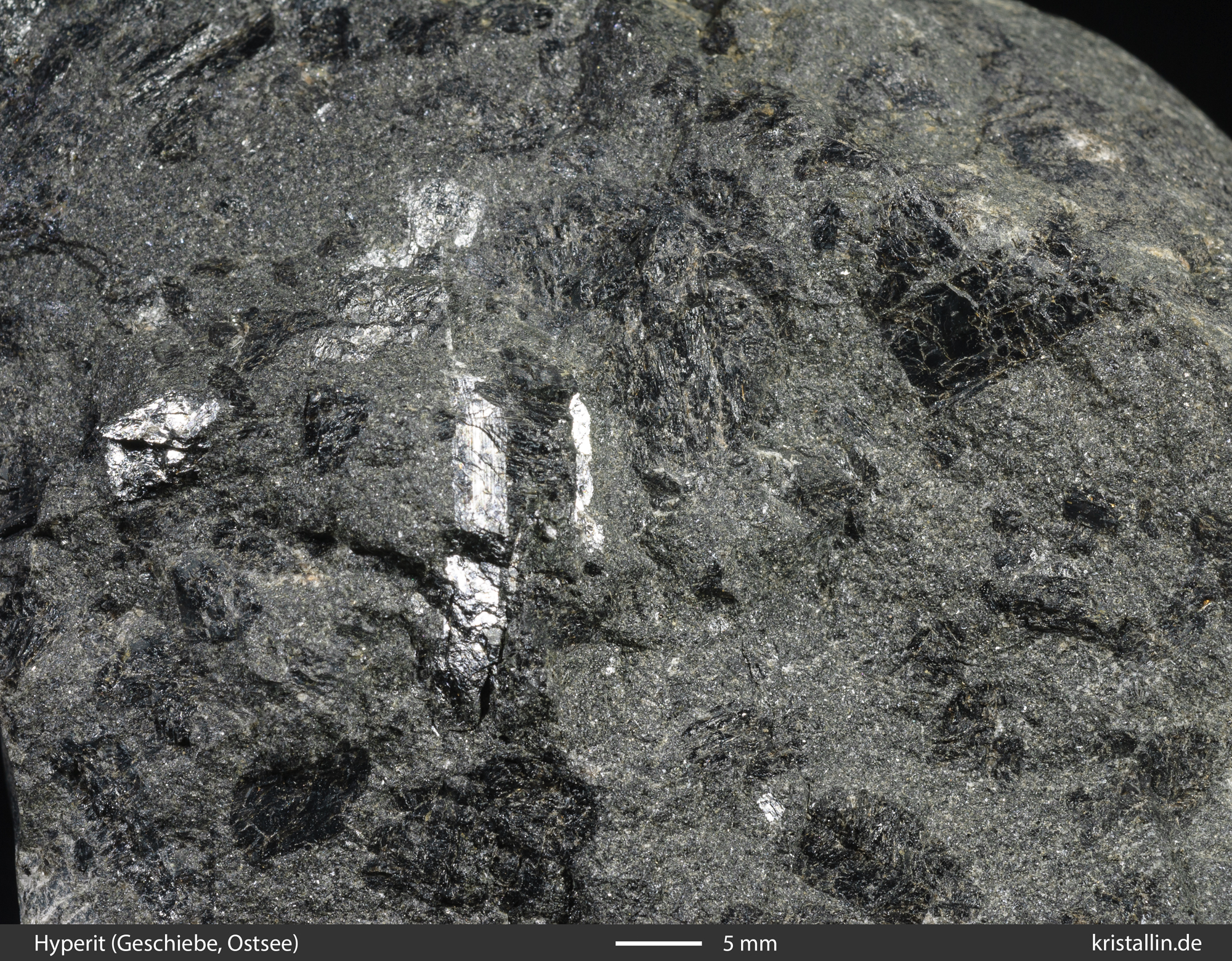 Hyperite can be found as glacial erratics in Northern Germany. Not often, but every now and then you can find some. If it is not metamorphically overprinted, a hyperite can be recognized quite easily. Especially if it contains larger plagioclase phenocrysts. You only have to search the narrow reflecting crystals for the typical plagioclas twins. If you find them and the rock is otherwise black and fine- to medium-grained, you can determine it as hyperite. There are no known similar rocks in the Baltic Shield outside the Protogine Zone. (Without a magnifying glass and without having seen the plagioclase twins themselves, of course this is not possible).