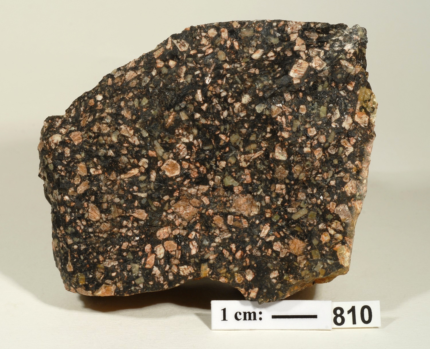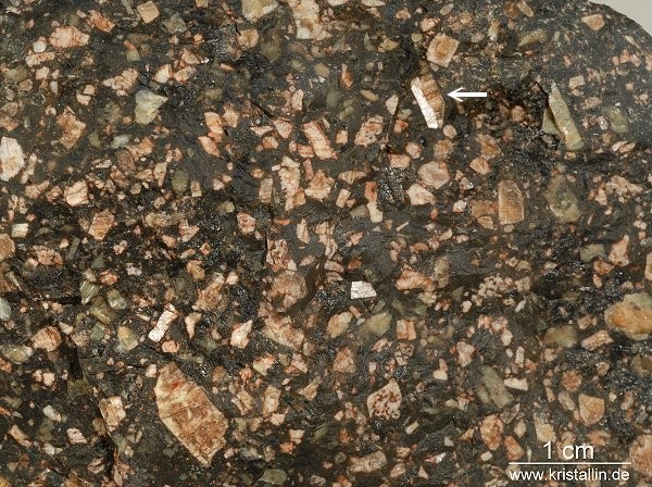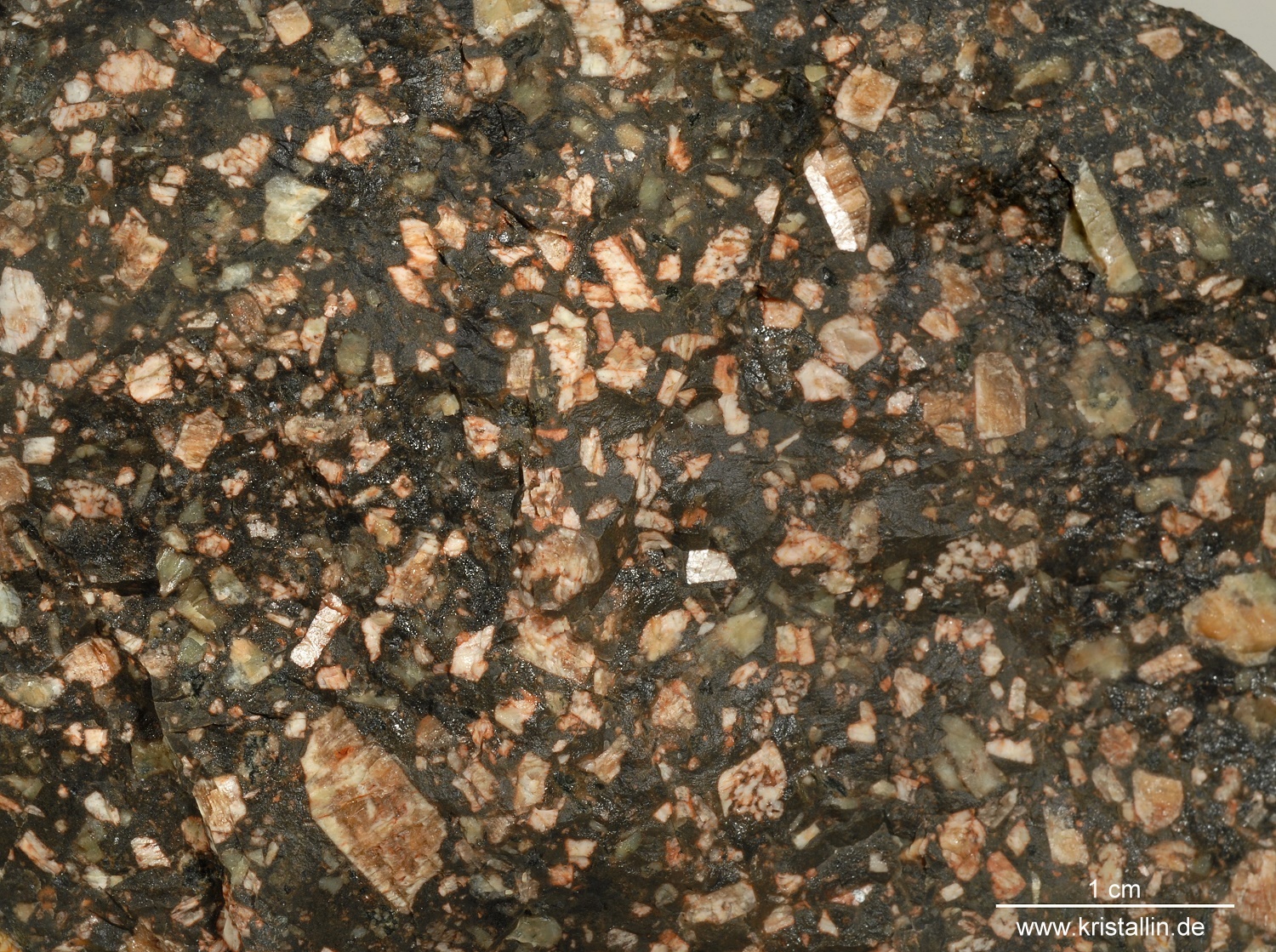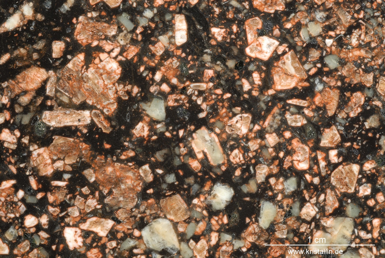 Einsprenglinge in einer tiefdunklen Grundmasse aufweist. Das Gestein