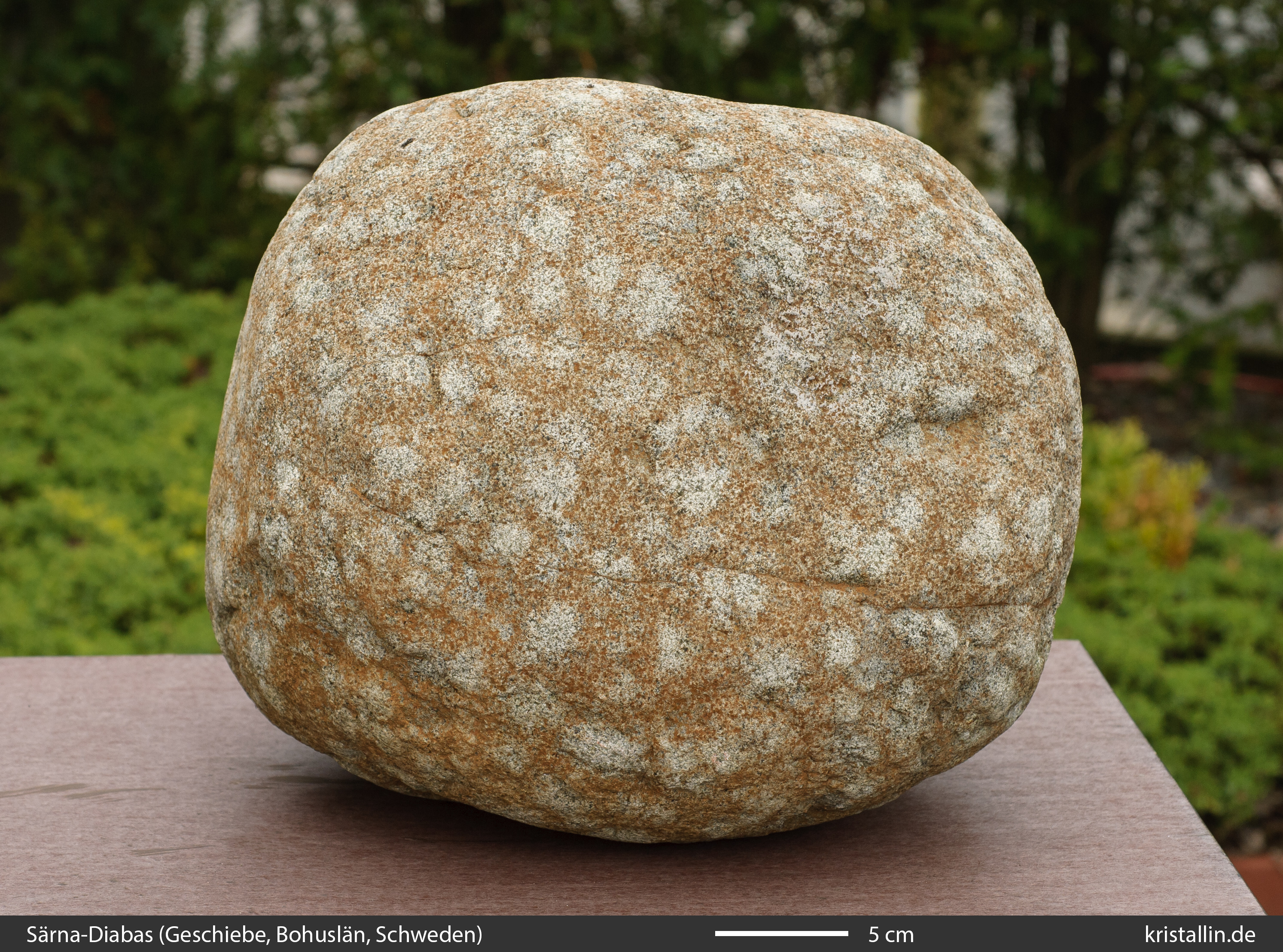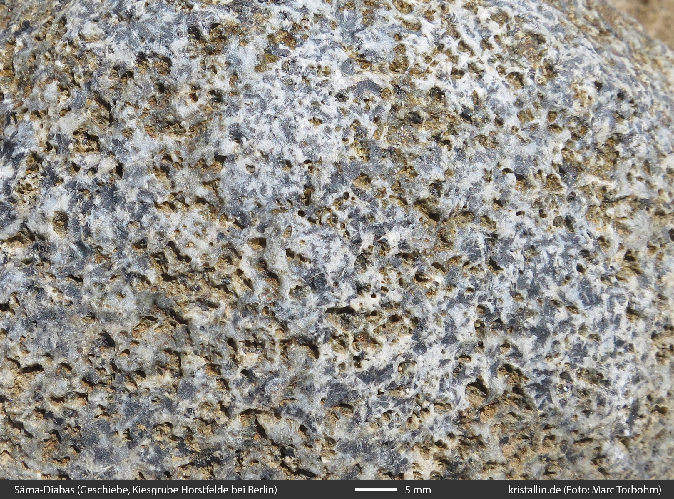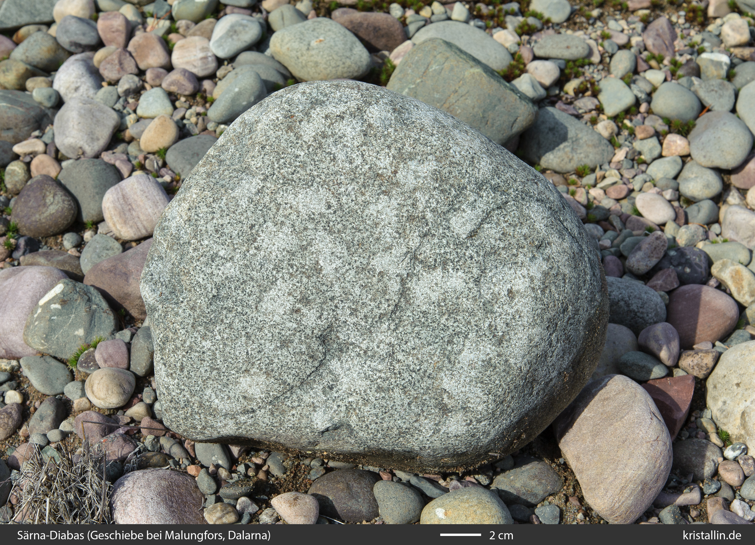 Für die Bestimmung eines Fundes als Särna-Diabas genügt es, wenn die rundlichen Knoten von ca. 2-3 cm Durchmesser und viele kleine Feldspatleisten neben einem dunklen Mineral vorhanden sind. Die Knoten müssen untereinander mindestens 1 cm Abstand haben, so wie auf den Bildern der in Dalarna fotografierten Nahgeschiebe.