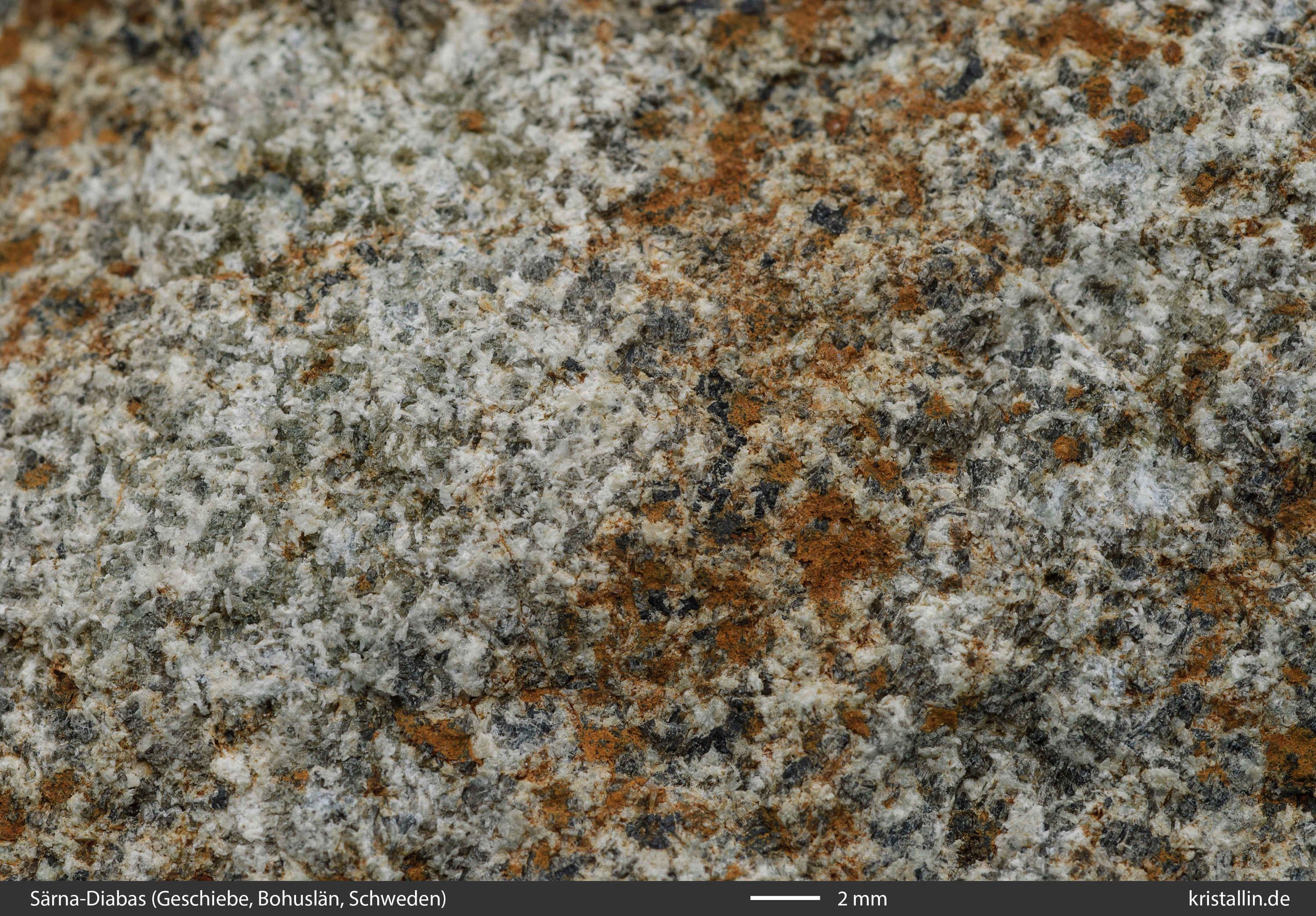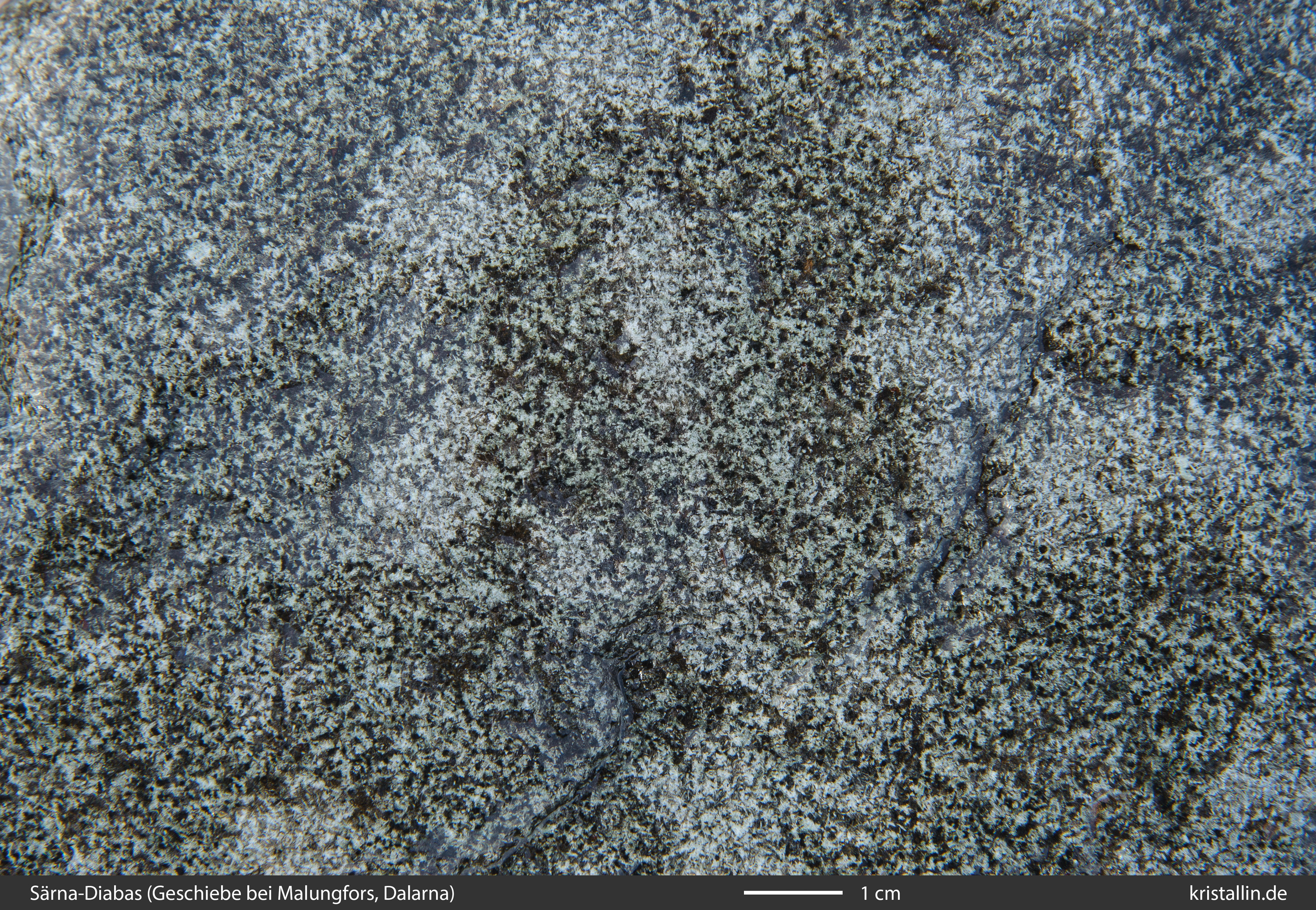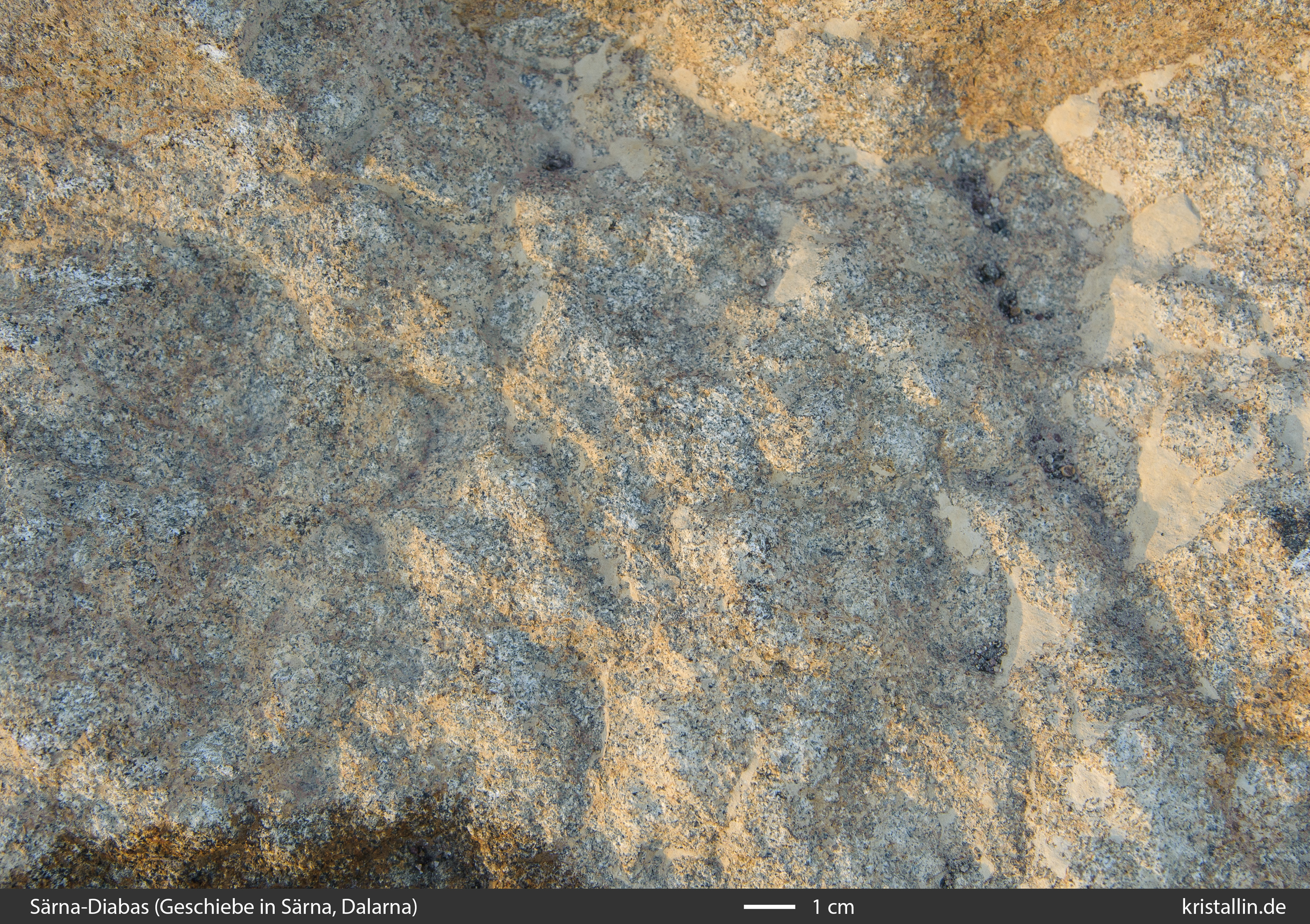 Aus der Nähe gleicht das Gestein einem Åsby-Diabas, denn es besteht wie dieser aus vielen Plagioklasleisten, die von dunklem Pyroxen umschlossen sind. Tatsächlich sind Åsby-Diabas und Särna-Diabas eng verwandt und auch gleich alt (SGU).