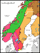 Sorsele-Granits innerhalb Skandinaviens, die untere einen Ausschnitt aus der