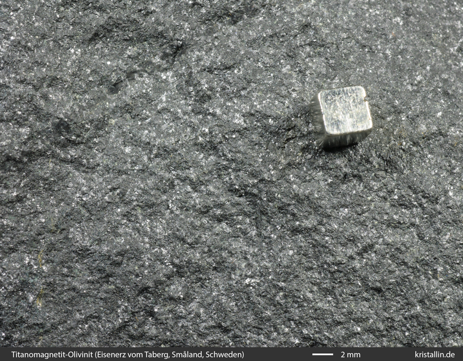 (2/15) Das Erz ohne Einsprenglinge aus der Nähe. Außer den glänzenden kleinen Magnetitkörnchen sieht man nur eine stumpf schwarze Grundmasse.
