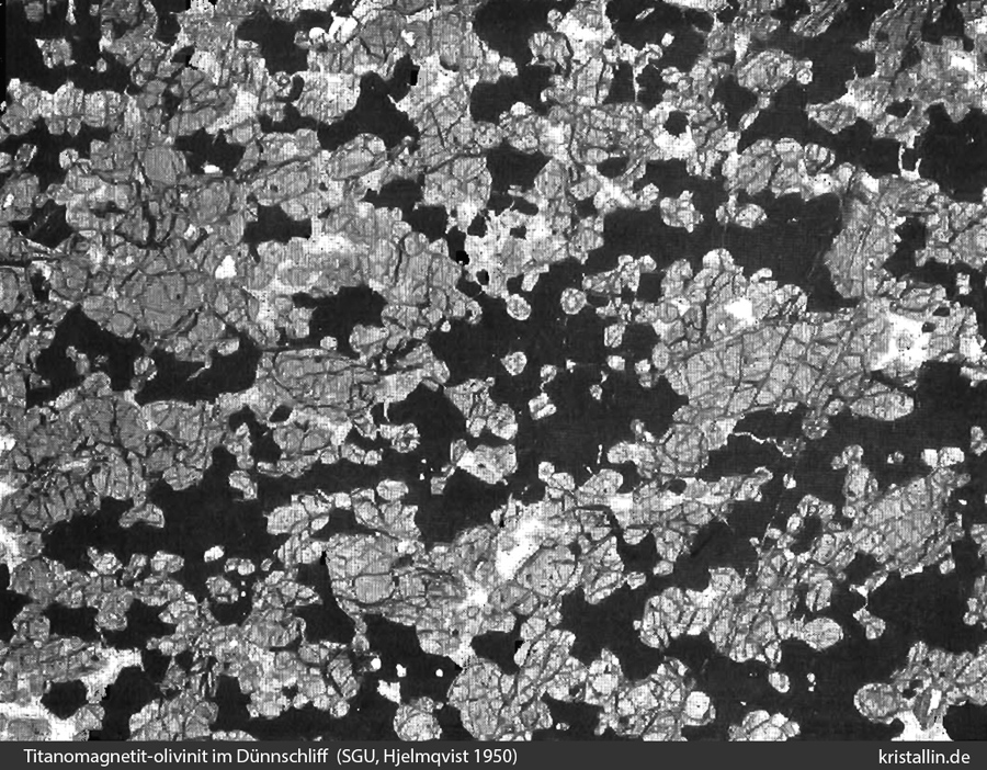 (3/15) Die Vergrößerung des Dünnschliffs zeigt, wie viel Olivin in diesem Gestein steckt. All das, was unter der Lupe als schwarze Grundmasse erscheint, ist Olivin, der hier im Durchlicht grau aussieht. Das zweite Mineral ist Magnetit (hier schwarz), aus dem man das Eisen gewonnen hat.