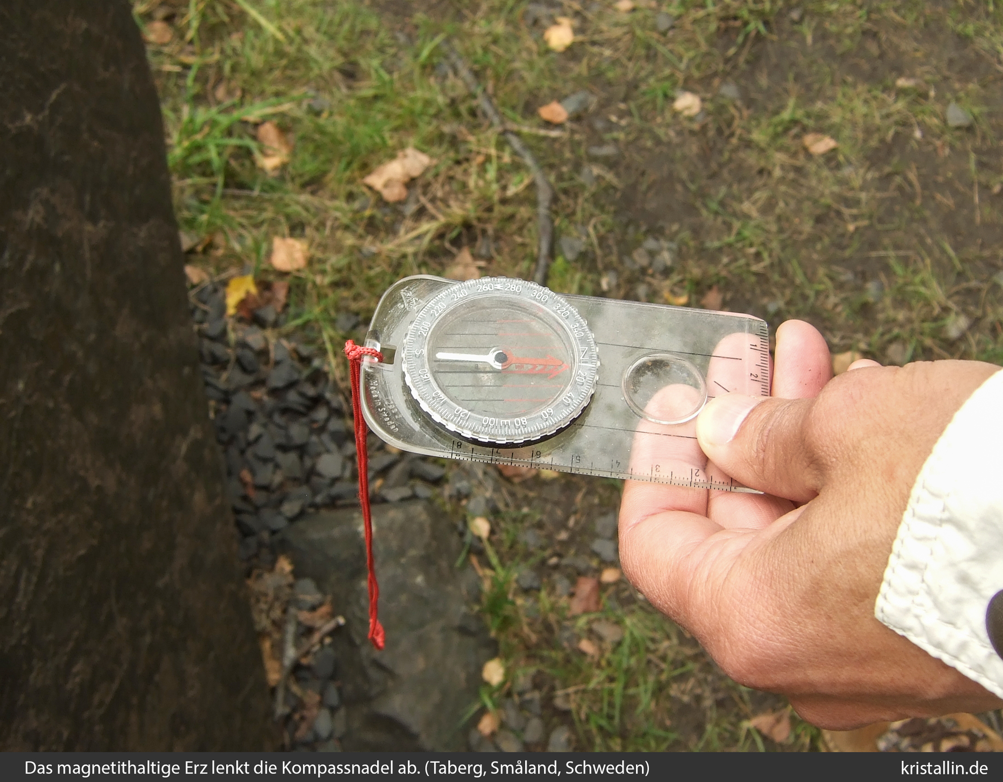 (13/15) Bewegt man den Kompass auch nur ein kleines Stück – hier nach rechts – dann bewegt sich die Nadel heftig im Kreis. Mit anderen Worten: In der Nähe dieses Berges ist der Kompass nutzlos.
