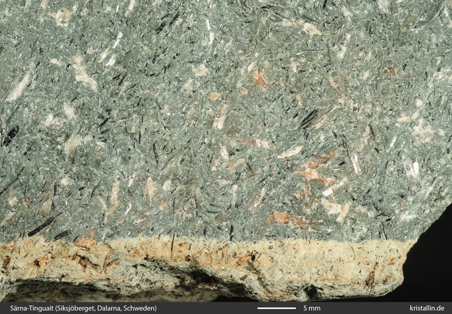 (2/30) Im Freien verwittern Tinguaite und bekommen eine dicke Kruste (unten). Braune Einsprenglinge können Cancrinit sein.