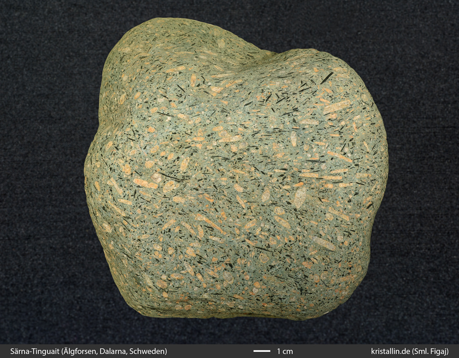 (3/30) Dieser Särna-Tinguait ist mit seinen großen Feldspäten und den auffälligen schwarzen Kristallen ein besonders schönes Exemplar.