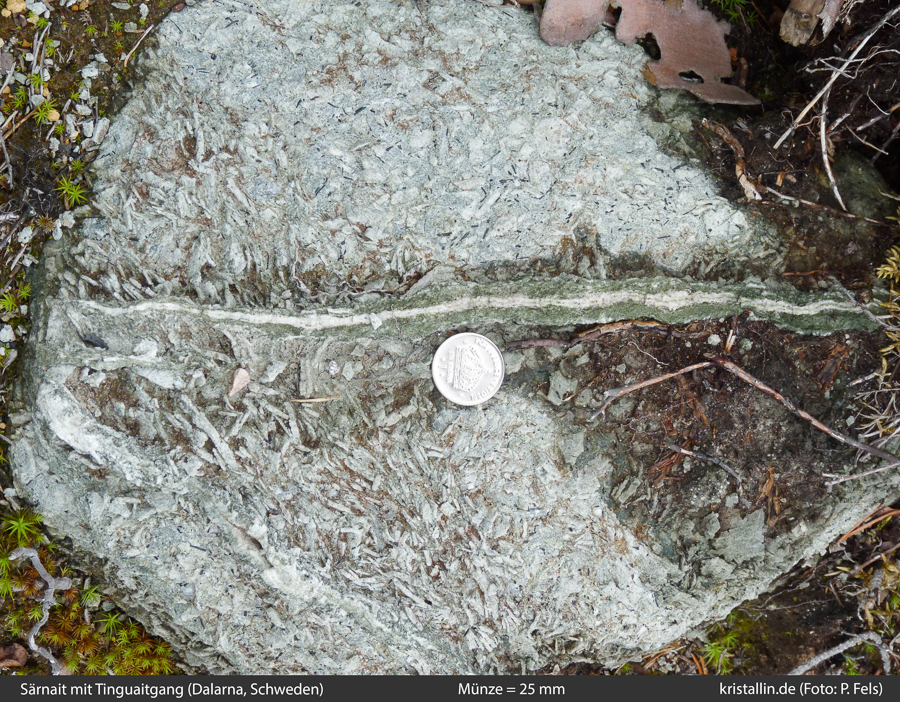 (20/30) Das grobkörnige Gestein ist wiederum der Särnait, also der Nephelinsyenit vom Siksjöberget. Der grüne Gang in der Mitte ist Tinguait. Was das Weiße ist, wissen wir nicht. Möglich wäre Kalzit.
