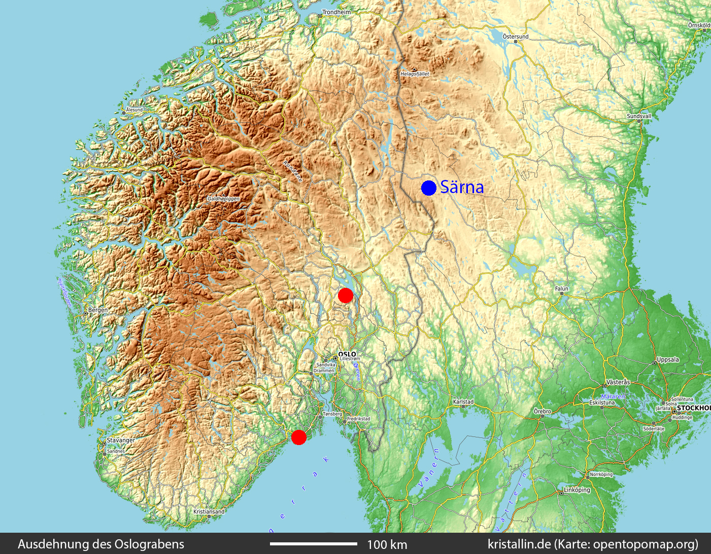 Das Alter der Särna-Tinguaite wurde mit 287±14 Ma bestimmt, also frühes Perm. Zur gleichen Zeit gab es heftigen Vulkanismus im Oslograben, in dem ganz ähnliche Alkaligesteine gefördert wurden. Dort öffnete sich ein Grabenbruch auf einer Länge von fast 200 Kilometern, dessen Verlängerung fast genau nach Särna zeigt. Auf der Karte zeigen zwei rote Punkte die Länge des Oslograbens in Norwegen.