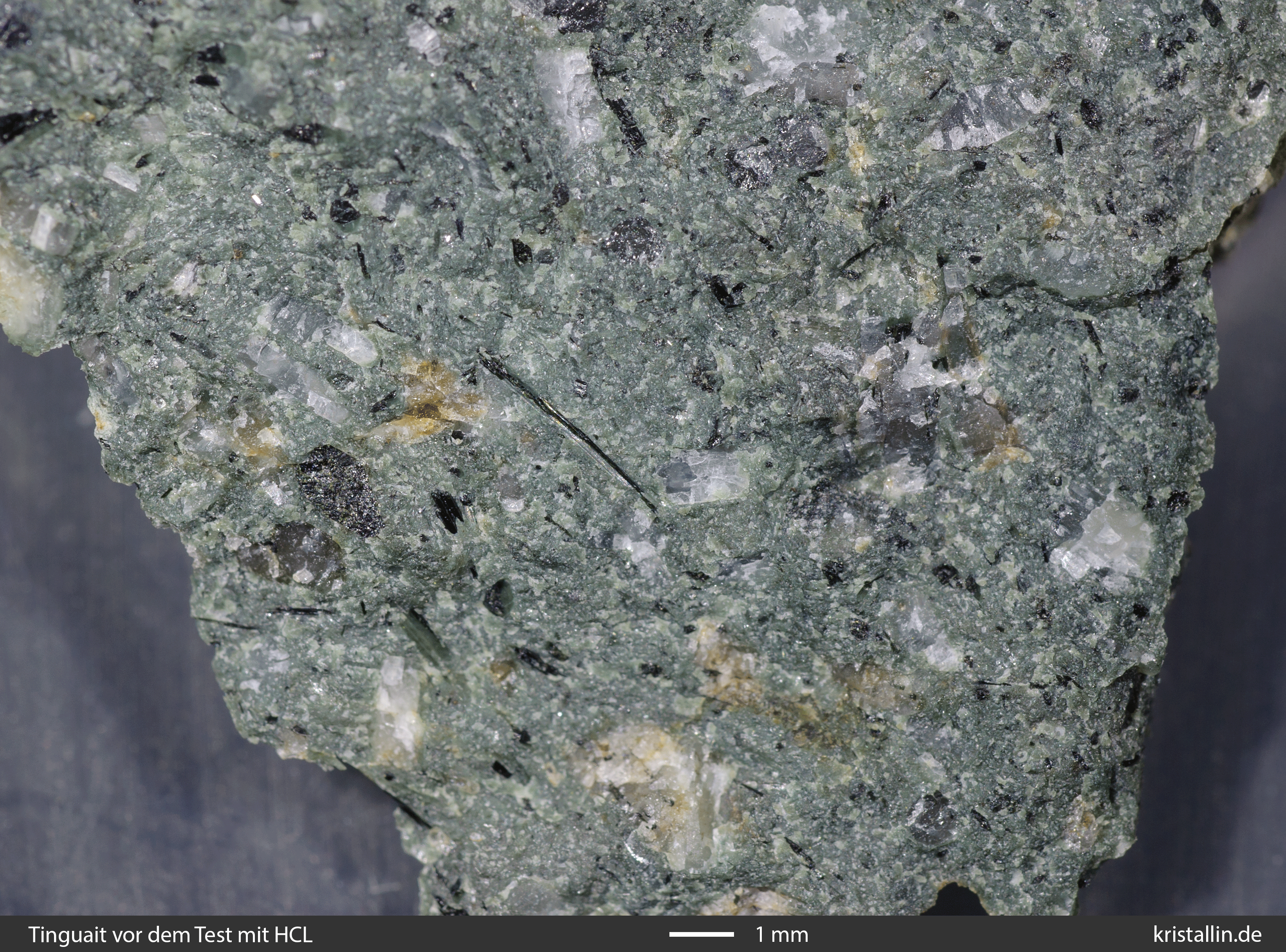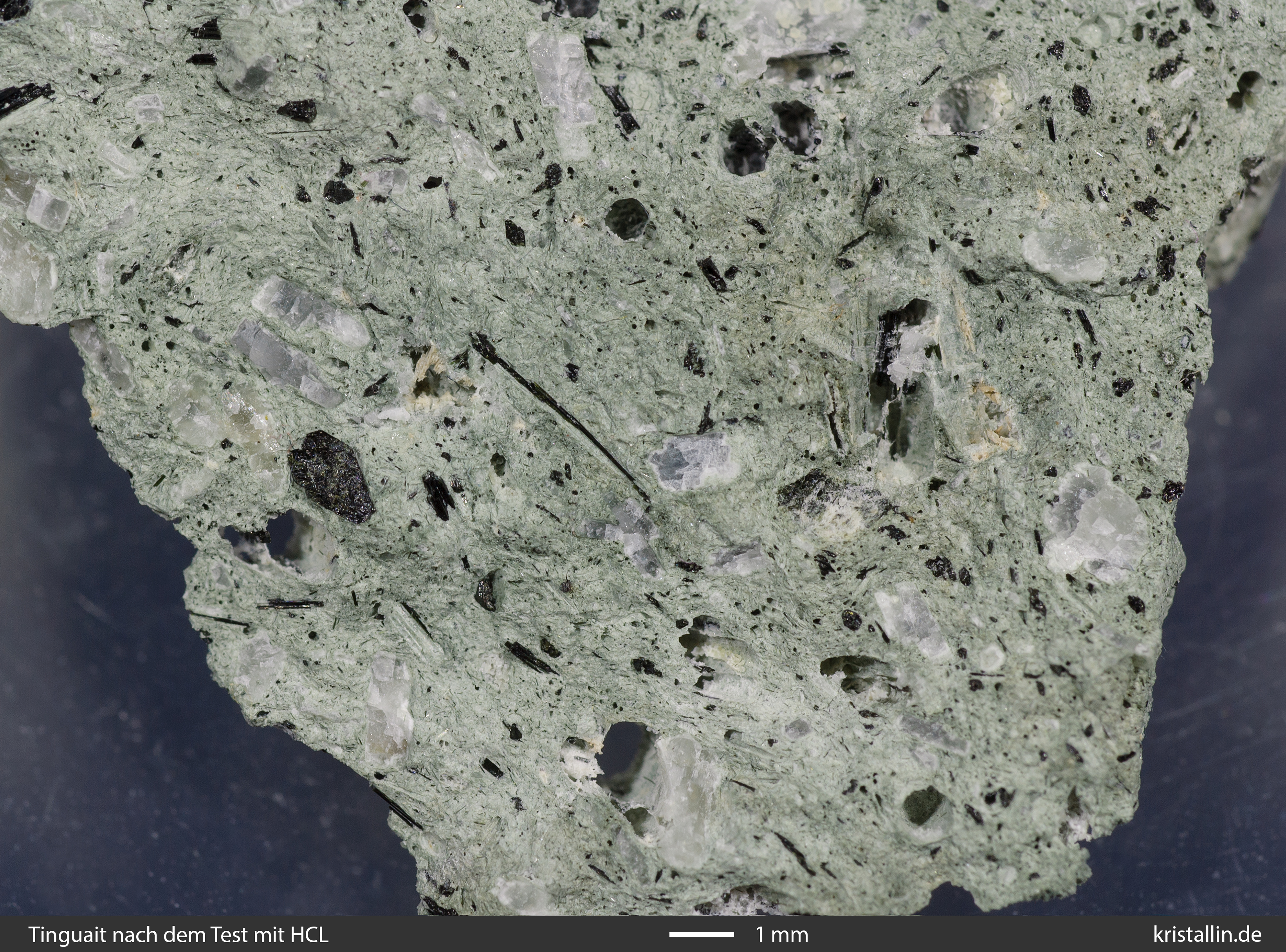 Wenn man ausreichend Probenmaterial hat oder besonders sorgsam zu Werke geht, kann man mit Salzsäure feststellen, ob es säurelösliche Minerale gibt. Beim Tinguait kommen dafür gleich drei in Frage: Kalzit, Cancrinit und Nephelin. Kalzit schäumt lebhaft und ist daran leicht zu erkennen. Cancrinit produziert ebenfalls Bläschen, aber nur moderat. Was sich auflöst, ohne zu schäumen, ist Nephelin. Nach dem Abspülen mit Wasser sieht man, wie viel es davon gab.
