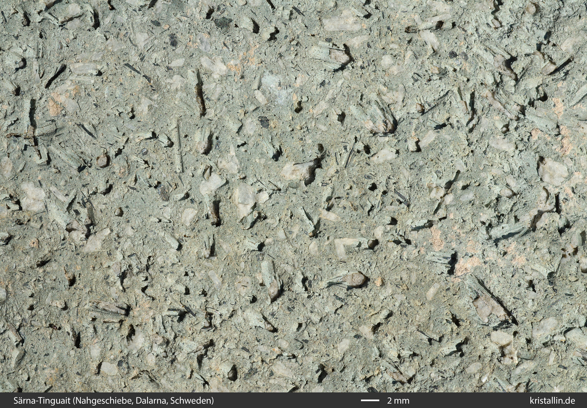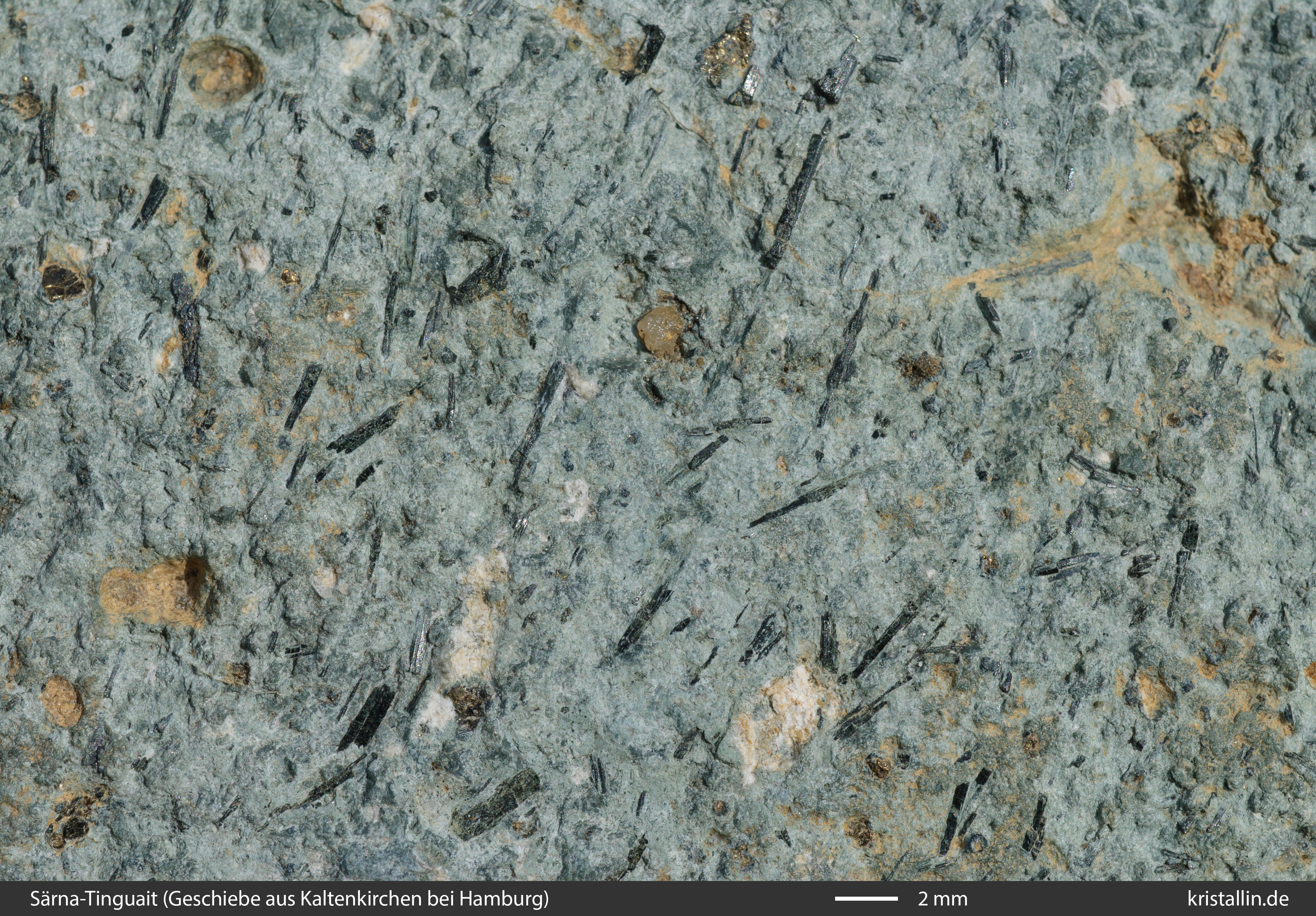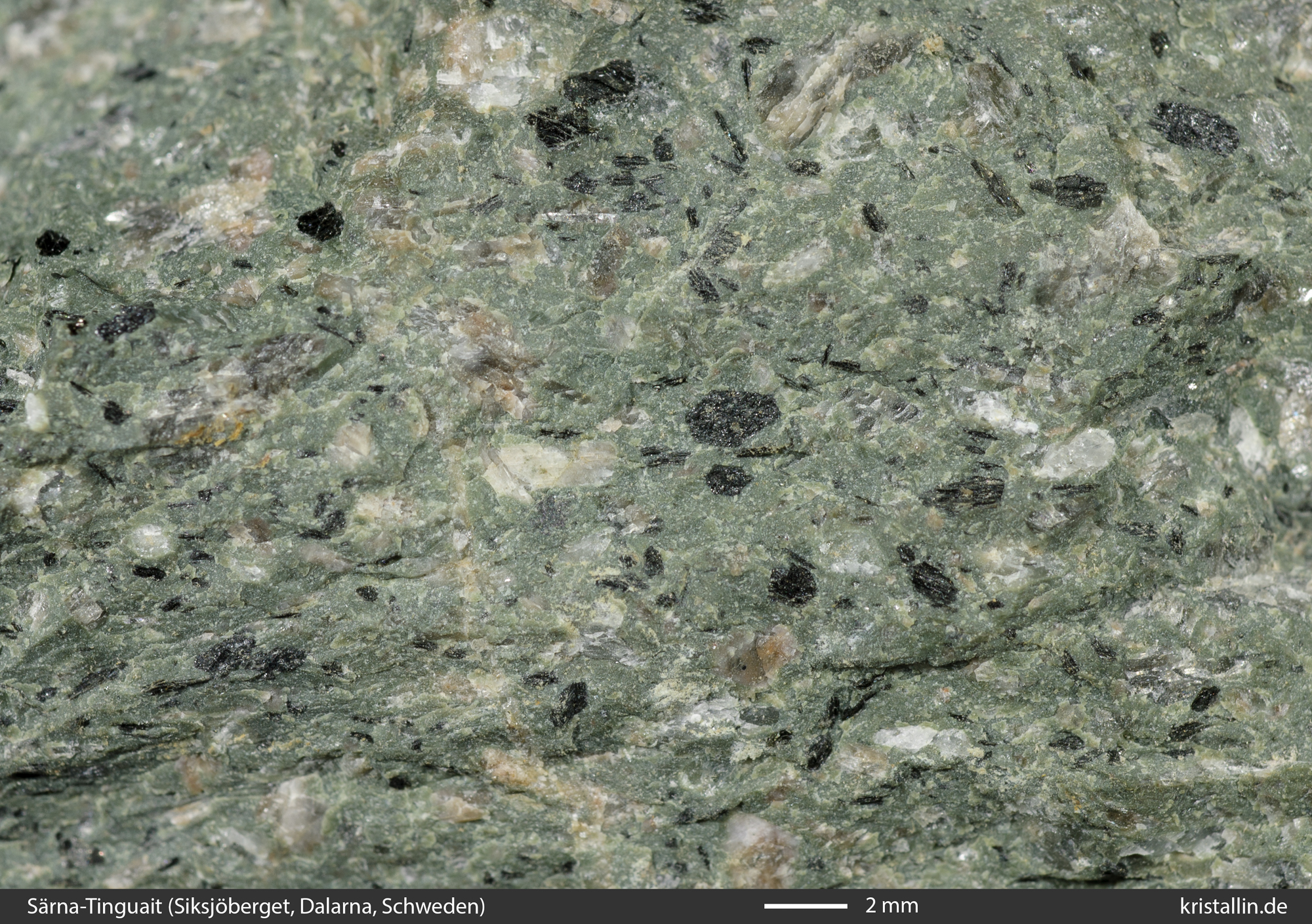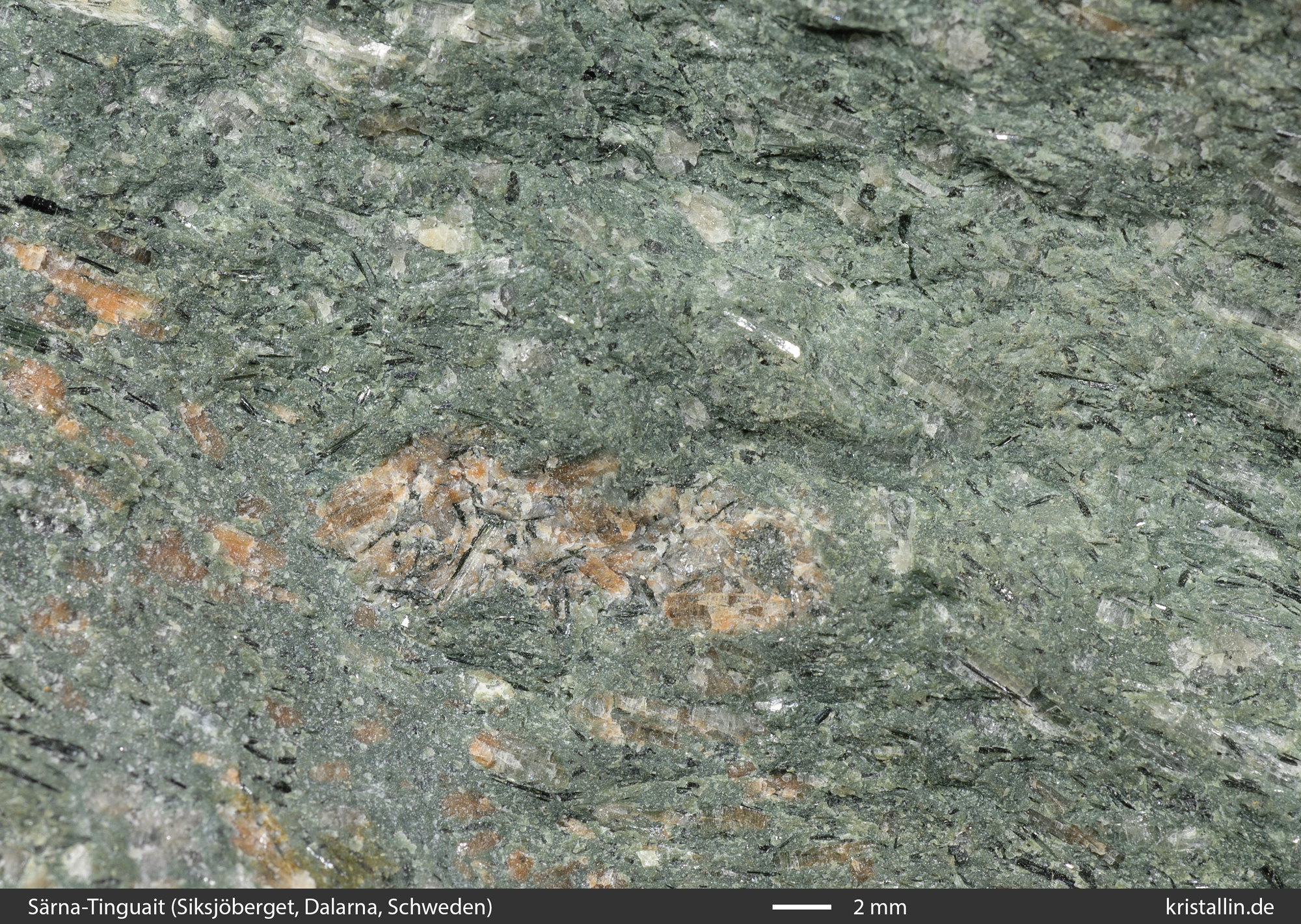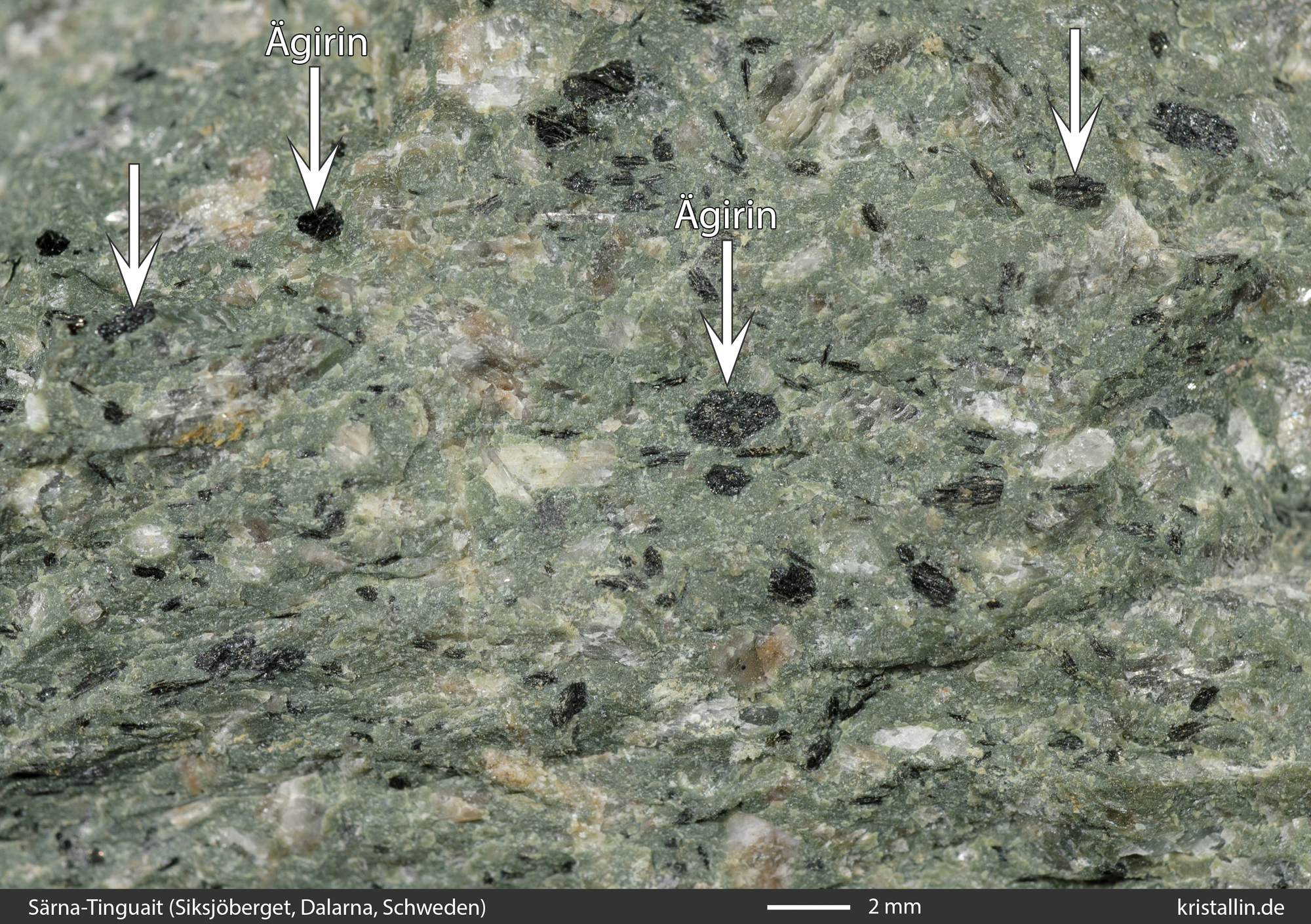 Für die Bestimmung eines Tinguaits konzentriert man sich auf die grünliche Grundmasse voller kleiner schwarzer Nadeln. Das ist Ägirin, ein natriumreicher Pyroxen. Die Ägirinnadeln sind entscheidend für das Erkennen eines Särna-Tinguaits und müssen reichlich vorhanden sein.