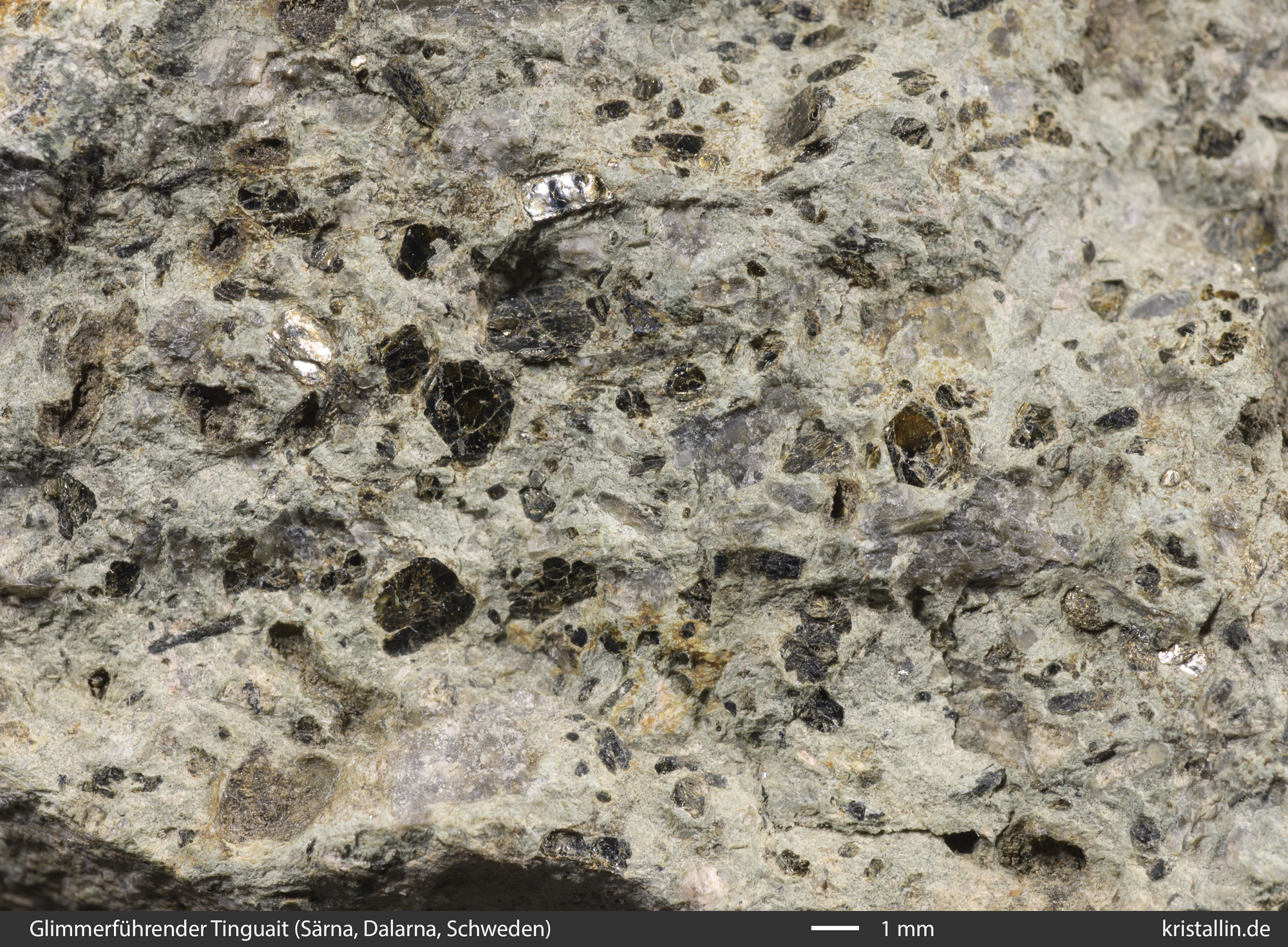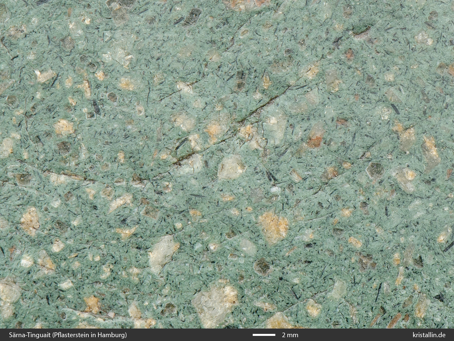 Wenn ein Geschiebe mit grünlicher Grundmasse viele kleine schwarze Nadeln enthält und dazu noch reichlich kleine Feldspäte, dann ist es ein Tinguait und stammt aus Dalarna in Mittelschweden.