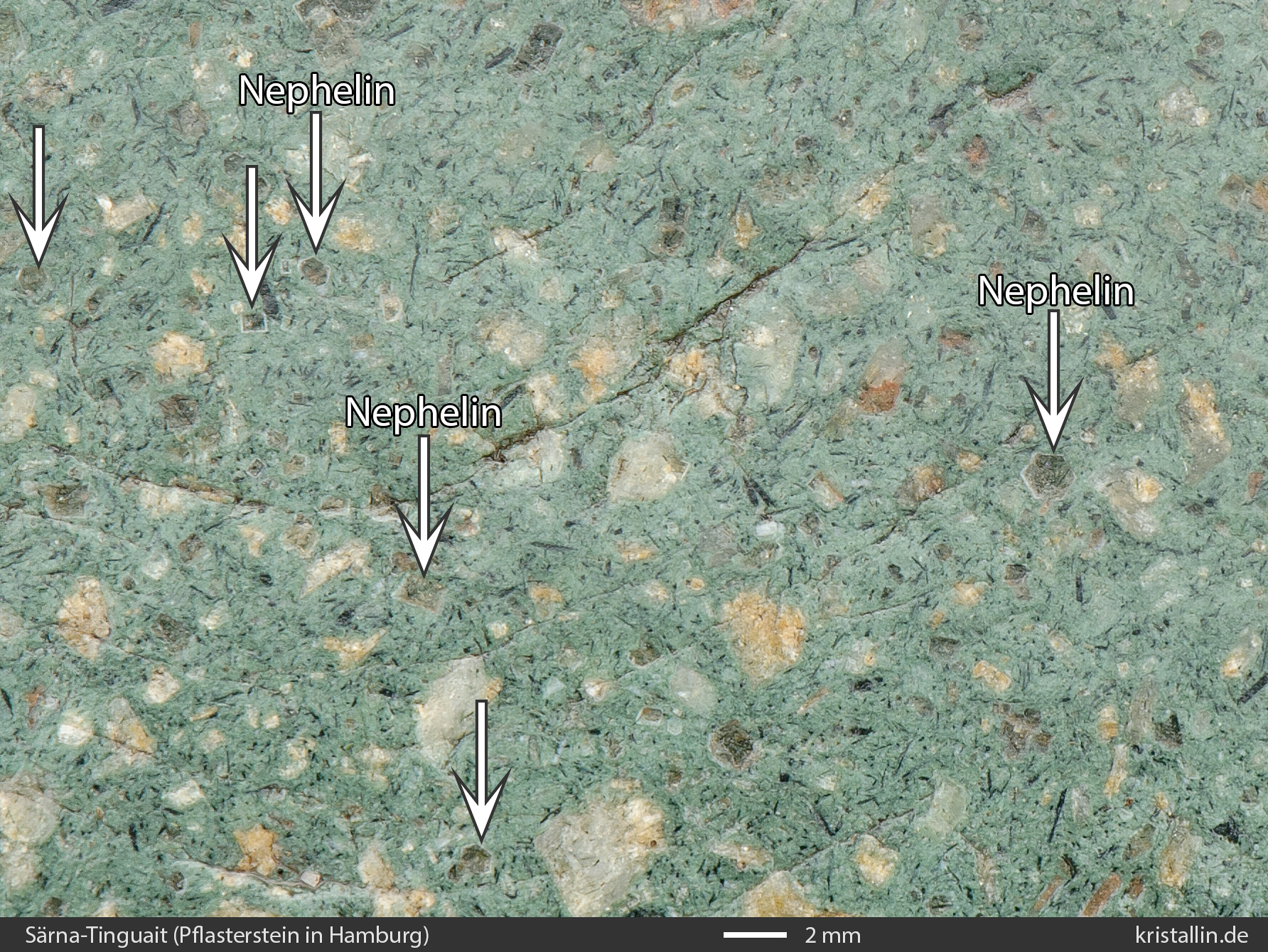 Nephelin ist in allen Särna-Tinguaiten enthalten. Er ist mit bloßem Auge aber nur dann erkennbar, wenn er sechsseitige schlanke Prismen bildet, die im Gestein als rechteckige oder sechseckige Kristalle mit hellgrauer oder bräunlich-gelblicher Farbe erscheinen. Mit etwas Glück erkennt man sie mit bloßem Auge, so wie im Bild 11. (Es stammt aus einer Dokumentation über das Porphyrwerk in Älvdalen.3)