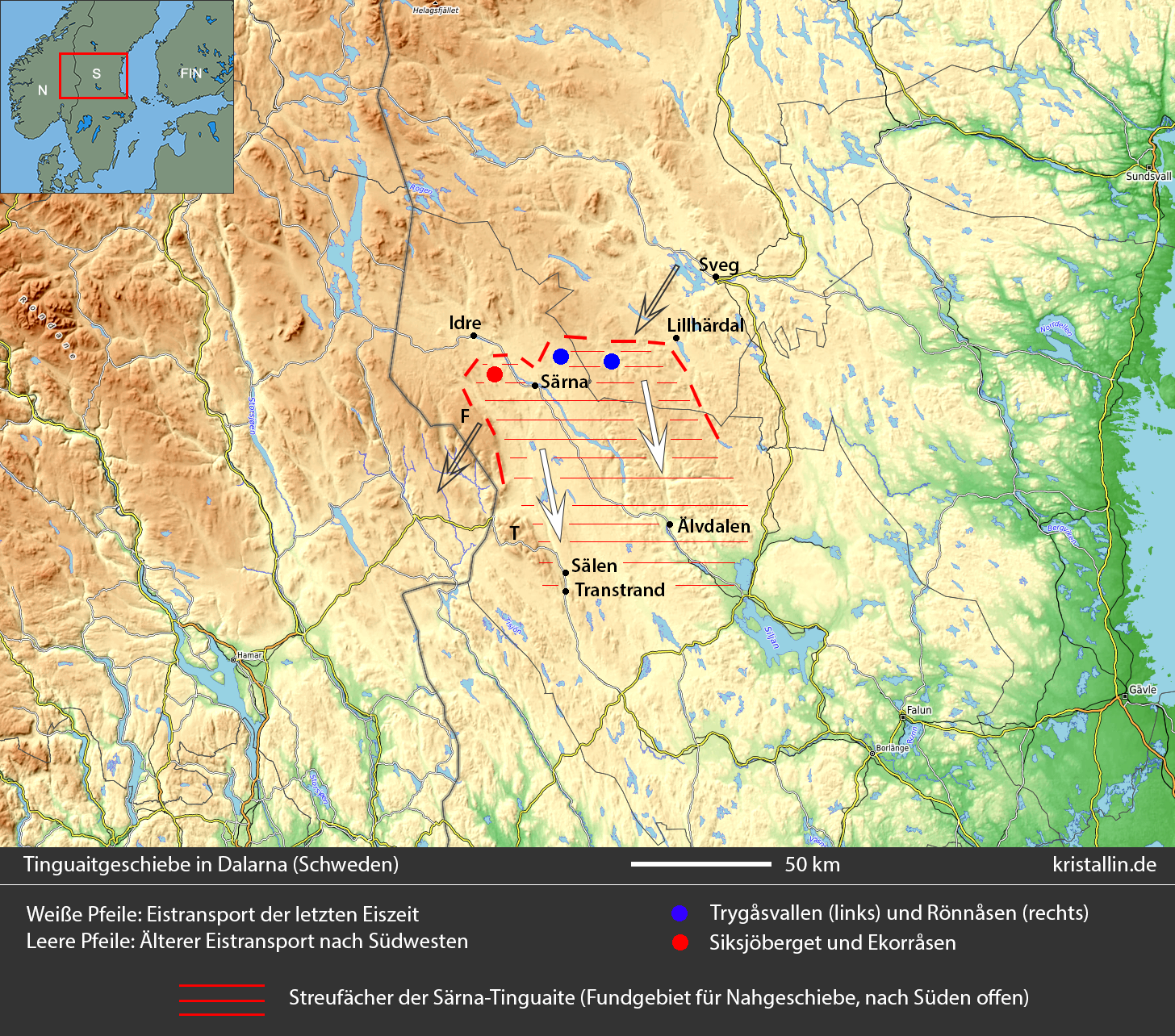 Östlich vom Fulufjället und entlang des Västerdalälven ist die Suche besonders sinnvoll, vor allem in der Umgebung von Sälen und Transtrand. Dort findet man Tinguaitgeschiebe bis in eine Höhe von mehreren hundert Metern über der Talsohle.