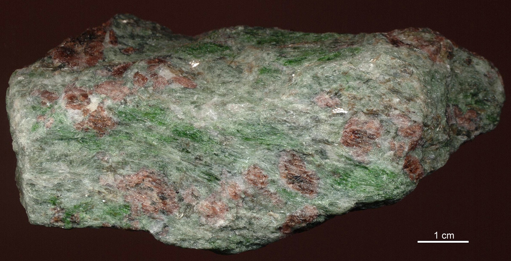 Ein Eklogit besteht hauptsächlich aus zwei Mineralen: Granat und Omphacit. Granat bildet rötliche