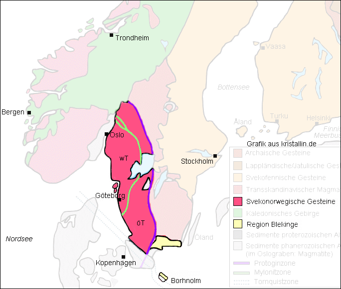 Die Region Blekinge mit ihrer Fortsetzung auf Bornholm. Die Gesteine dort haben ein Alter