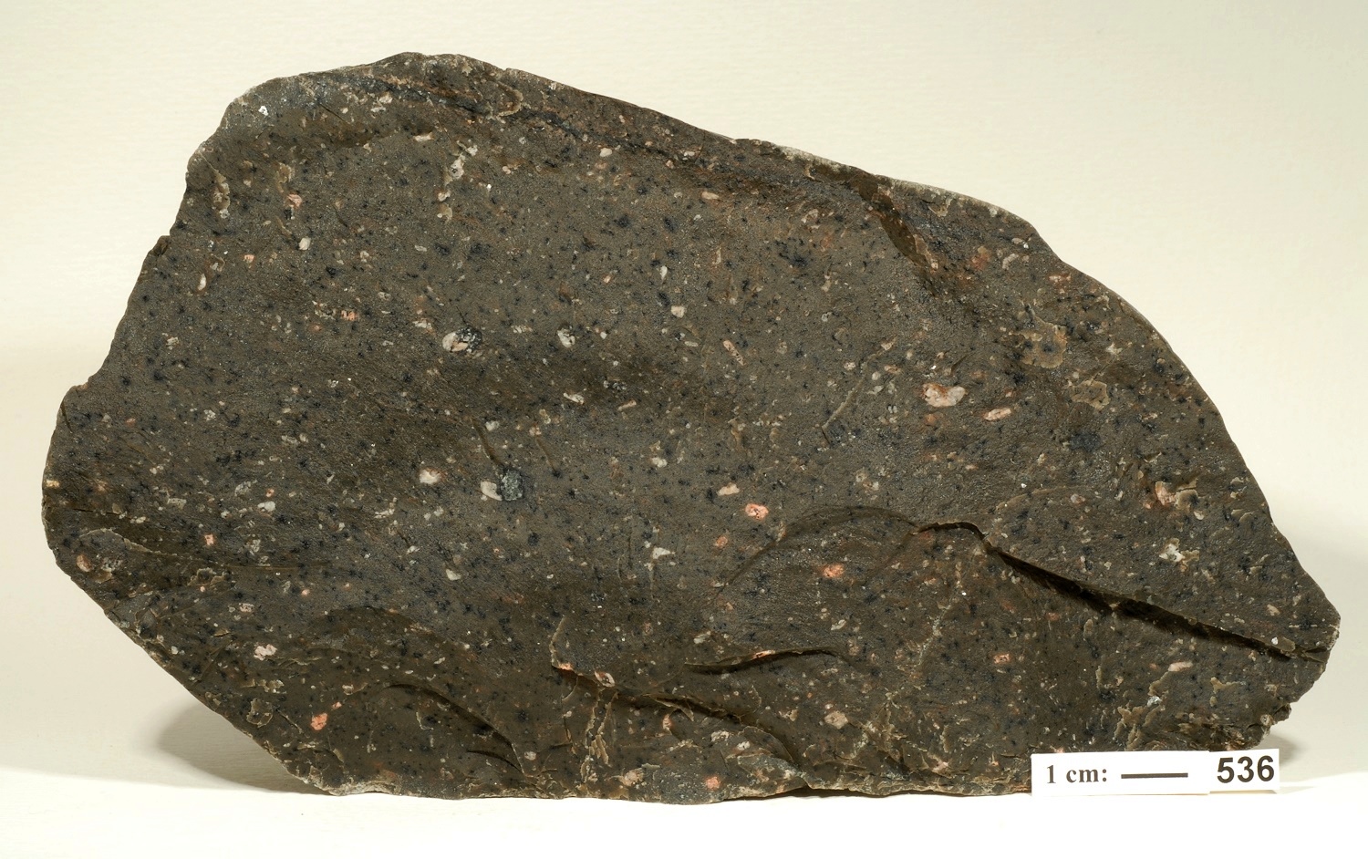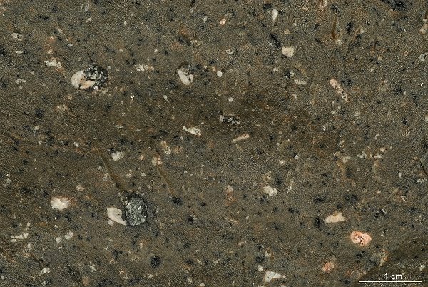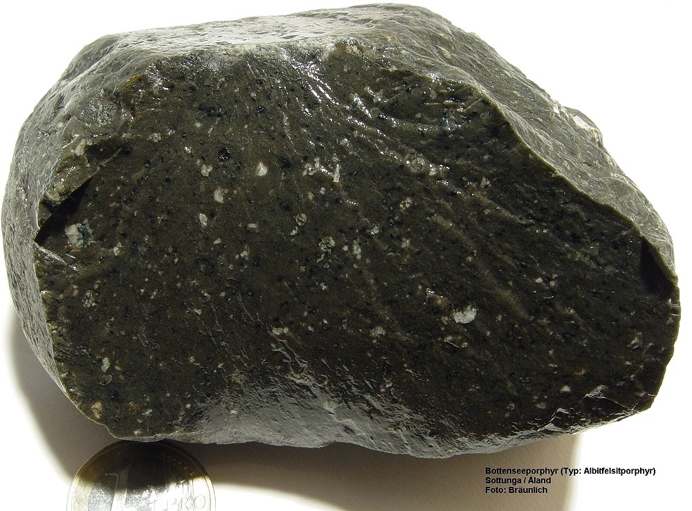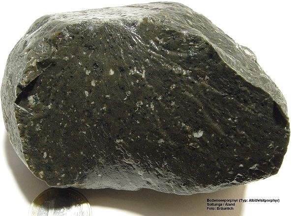 Bottenmeer-Porphyren. Innerhalb dieser Gruppe nimmt er einen bedeutenden Anteil ein. Vermutlich entfällt mindestens ein Viertel der Bottensee-Porphyre, die im Geschiebe zu finden sind, nur auf diesen einen Typ. Sein auffälliges Merkmal ist das einsprenglinsarme Gefüge, in dem sich nur einige kleine, weißliche Feldspäte (Albit) finden. Manchmal fehlen sogar diese fast völlig. Die Grundmasse ist dunkelgrau bis braunschwarz, uneinheitlich schlierig gefärbt und vor allem extrem hart und zäh. Deswegen ist es nicht verwunderlich, daß steinzeitliche Werkzeuge aus diesem Material gefertigt wurden. Eine weitere Besonderheit ist, daß sich die Außenseite dieser sehr dunklen Gesteine durch die Verwitterung ziemlich hell, fast weiß (!) färbt. Das Gestein enthält keinen sichtbaren Quarz und dunkle Minerale nur in kleinen Flecken. ![]() ![]() Die Bilder zeigen das typische Gefüge des Albitfelsit-Porphyrs. Meist ist die Grundmasse grauschwarz. Beide Gesteine (oben und unten) stammen von Åland. Im Bild unten sehen Sie eine schwach bräunliche bis graue Grundmasse. Die einzelnen, etwas rötlichen Einsprenglinge sind (wahrscheinlich) Alkalifeldspäte. Sie kommen gelegentlich vor, treten aber immer nur vereinzelt auf. Die meisten Einsprenglinge im Albitfelsit-Porphyr bestehen aus hellem oder weißem Albit. Die Bilder sind etwas aufgehellt. In natürlicher Tönung sind die Proben dunkler, dann wären aber die Einzelheiten hier auf den Fotos nicht gut zu erkennen. ![]() ![]() Die Einsprenglinge sind meist unregelmäßig geformt und teilweise zerbrochen. Die charakteristischen polysynthetischen Verzwilligungen, an denen man Plagioklase erkennt, sind nur ab und zu zu sehen. Oft sind die weißen Feldspäte getrübt und zeigen keine Einzelheiten. Die nächste Probe stammt vom finnischen Festland aus einer Kiesgrube bei Söörmarkku, etwa 20 km nördlich von Pori. Beachten Sie den muscheligen Bruch, den man im unteren Bildteil erkennen kann (am besten in der Vergrößerung). Die Scherben, die sich beim Aufschlagen des Gesteins gebildet haben, sind rasiermesserscharf. ![]() ![]() Auch in diesem Ausschnitt dominieren die kleinen, weißen Albiteinsprenglinge, die regellos in der dichten, zähen und ausgesprochen harten Grundmasse verteilt sind. Auch hier findet sich unten rechts ein einzelner Alkalifeldspat, der an seiner bläßrötlichen Farbe zu erkennen ist. ![]() ![]() Im mitteleuropäischen Geschiebe sind diese Porphyre wegen der großen Entfernung seltene Raritäten. Trotzdem kommen sie vor. Das nächste Bild zeigt ein Geschiebe aus Groß Pampau in Schleswig Holstein: ![]() ![]() Albitfelsit-Porphyre sind gut zu erkennende Leitgeschiebe für die Bottensee. Beachten Sie, daß die Grundmasse dieser Gesteine gelegentlich schlierig und inhomogen gefärbt ist, das Gefüge aber keine Deformationen aufweist. Die zerbrochenen Albiteinsprenglinge zeigen zwar regellose Umrisse, sind aber nicht ausgelängt bzw. verformt. Ähnlich aussehende, dunkle und einsprenglingsarme Porphyre kommen auch in Schweden vor. Die Vertreter aus Småland sind jedoch in der Regel metamorph überprägt und haben ein streifiges Gefüge (siehe Helleflinte). Auch in Dalarna kommen ähnlich aussehende Gesteine vor, dort sind aber die Einsprenglinge in der Regel heil, kaum zerbrochen und zeigen eher schöne, eckige Umrisse. Den schwedischen Porphyren fehlen auch die vielen kleinen, schwarzen Flecken, die hier im Albitfelsit-Porphyr in der Grundmasse enthalten sind. Alle Proben hier wurden mit leicht angefeuchteter Bruchfläche fotografiert. |