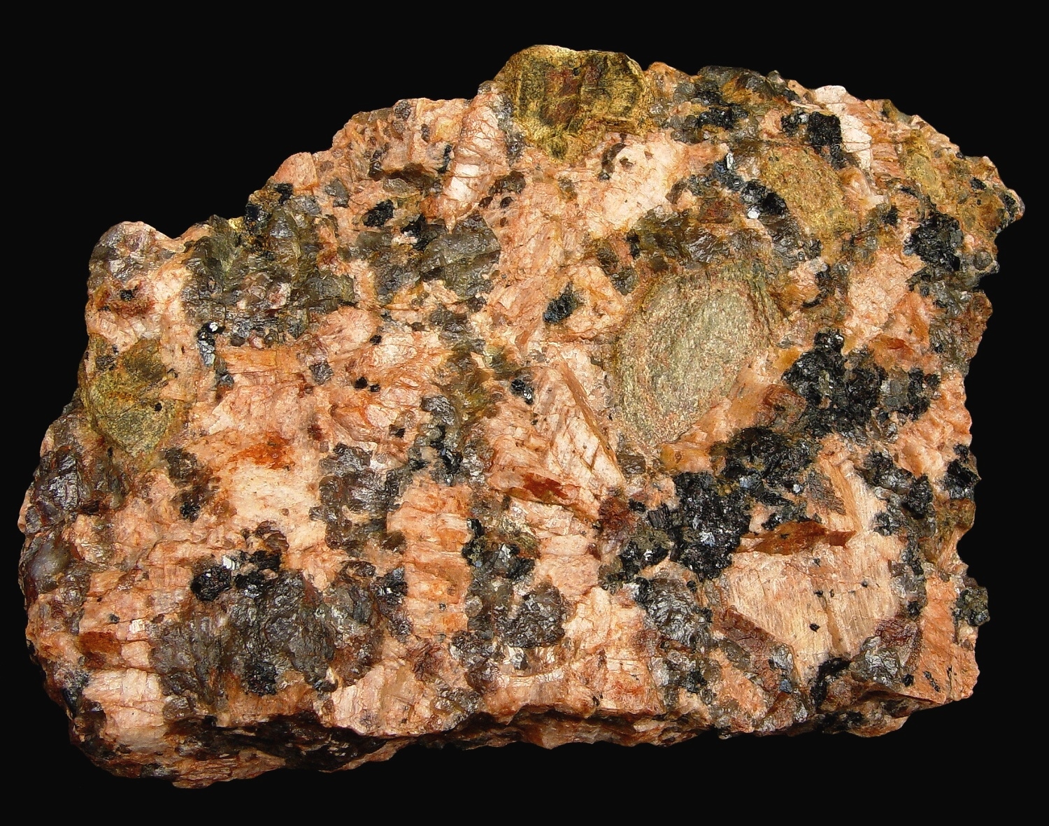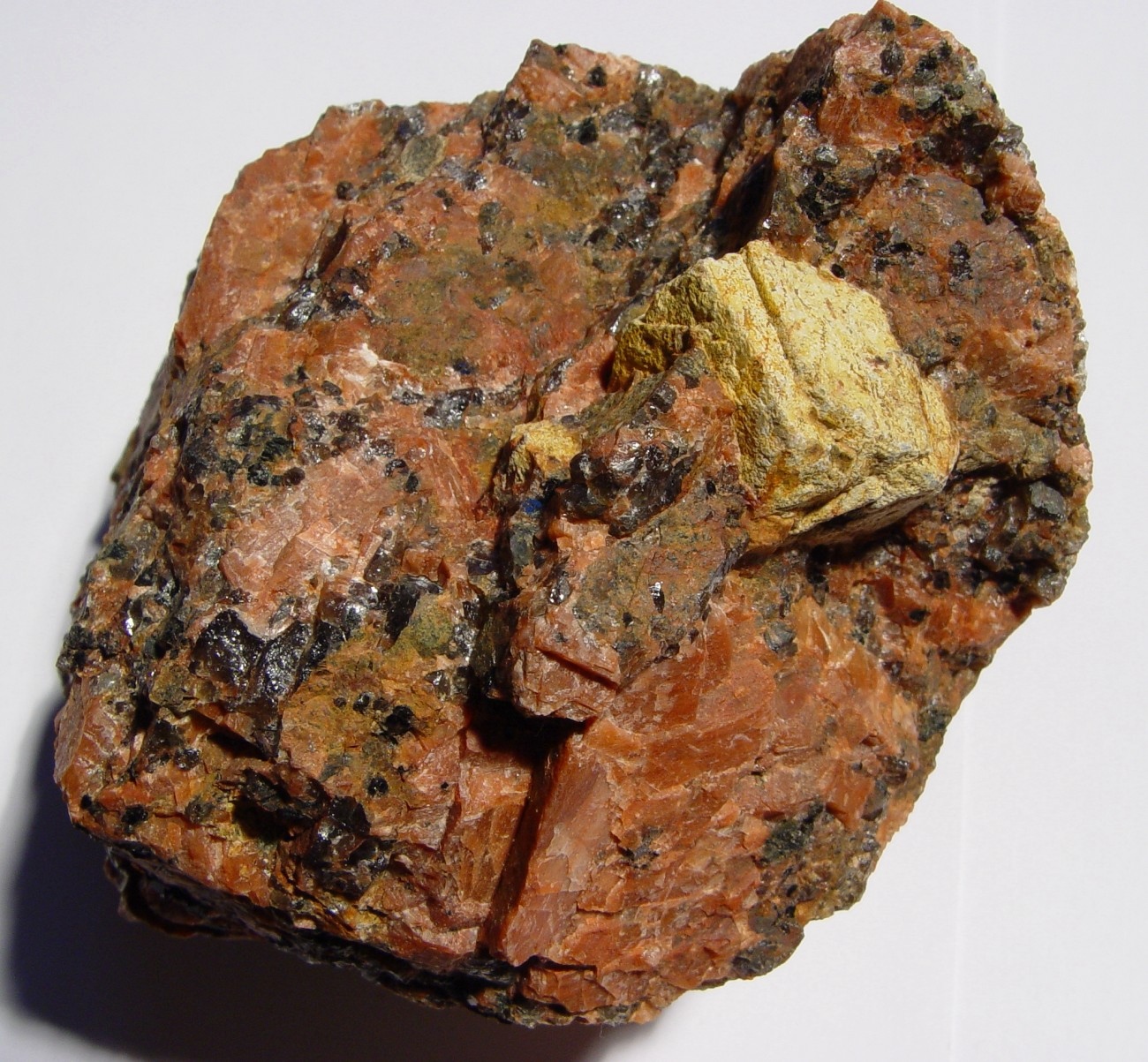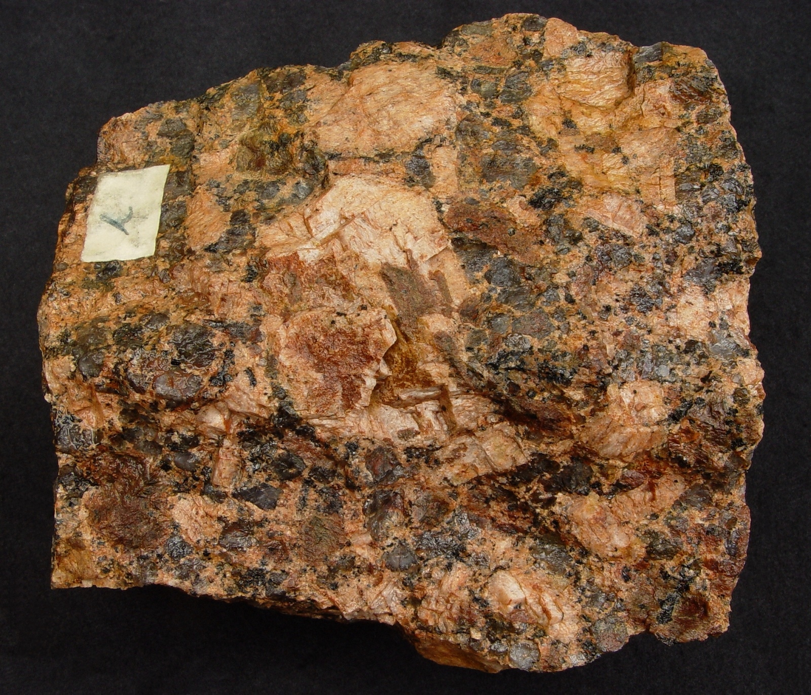 Probe von Fritz Mende, 1924, Söderharu. Breite etwa 15 cm. Die Probe stammt aus dem Naturkundemuseum in Leipzig. Die gelblichen Minerale sind weitgehend umgewandelter Plagioklas. Zum Teil sind in den inneren Teilen noch Reste vom ursprünglich rotbraunen Plagioklas erhalten. Der Alkalifeldspat findet sich auch hier in großen Einzelkristallen und vielen kleineren, die oft als Karlsbader Zwillinge auftreten. Die Quarze (2. Generation) sind grau bis bräunlich, dazu kommen die Blauquarze der 1. Generation. Das Gestein führt tiefschwarzen Biotit. | |||||||||||||||||||||||||||||||||||||||||||||||||||||||||||||||||||||||||||||||||