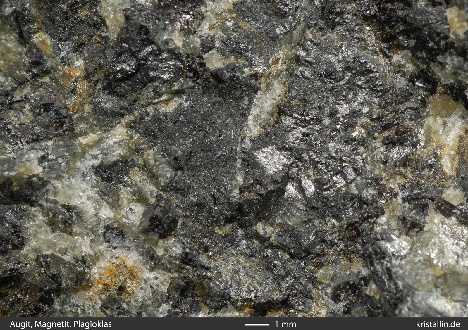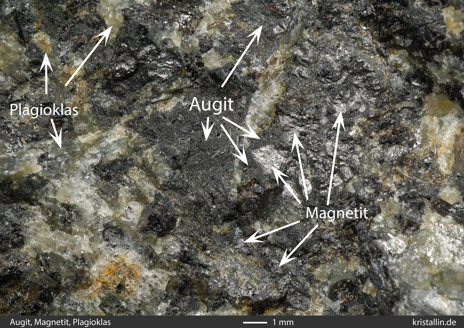 zerlegen und sich die dunklen Minerale anschauen. Alles Schwarze ist Augit,