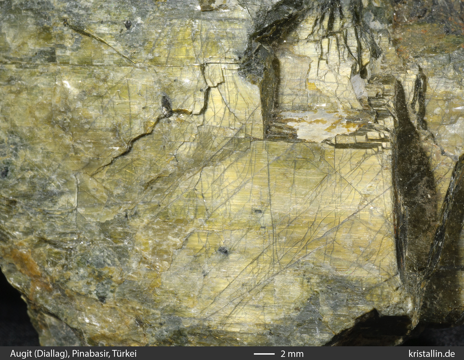 beiden ist die für Pyroxene typische mäßige Spaltbarkeit (Bildmitte) und den