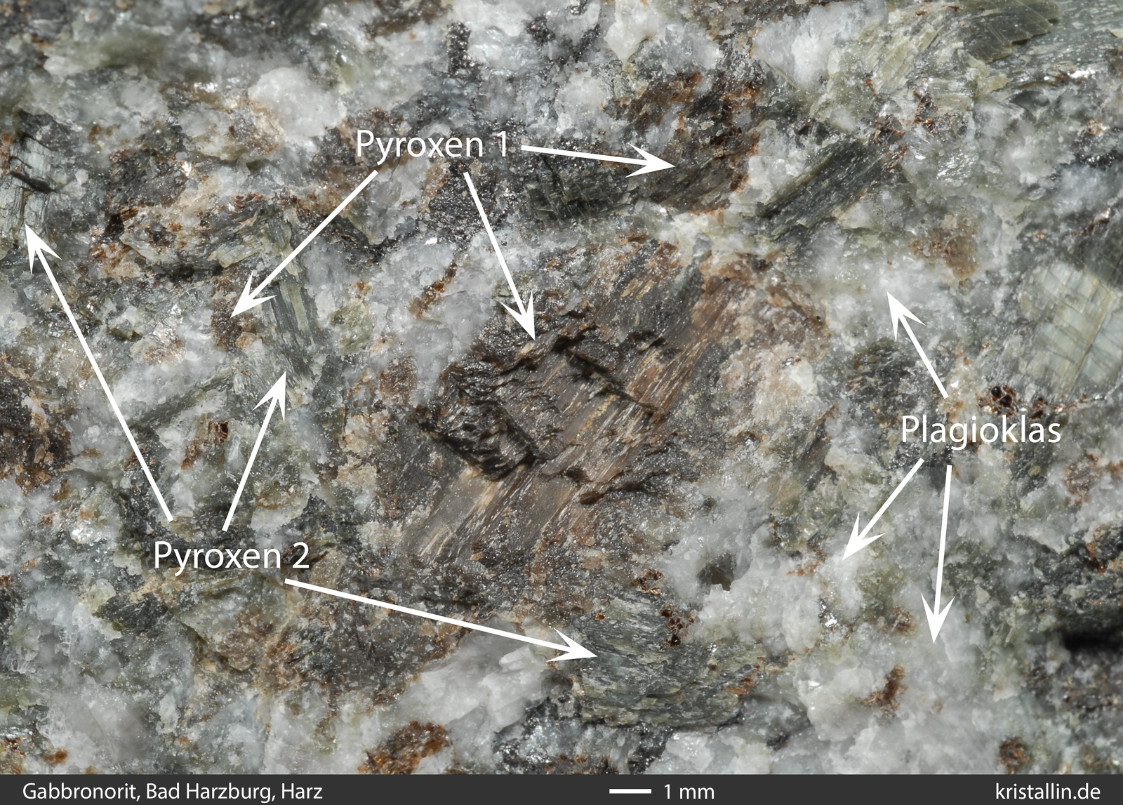 Bei dunklen Gesteinen wie hier rechts sind Plagioklas und Pyroxen(e) zu