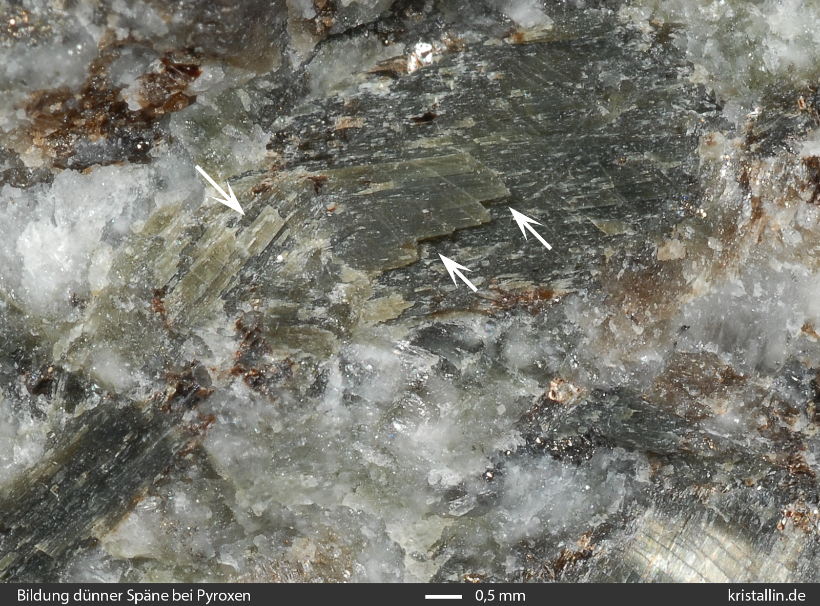 Entmischungslamellen im Kristallgitter her. Bei Orthopyroxenen wird