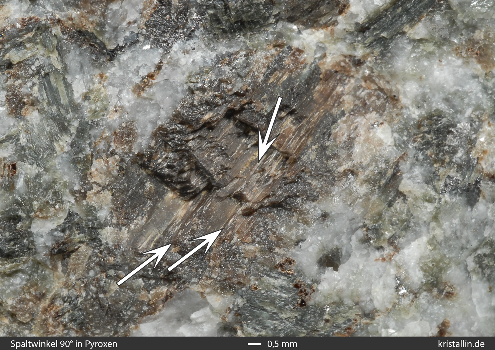 Die Spaltwinkel der Pyroxene spielen bei der makroskopischen Bestimmung kaum