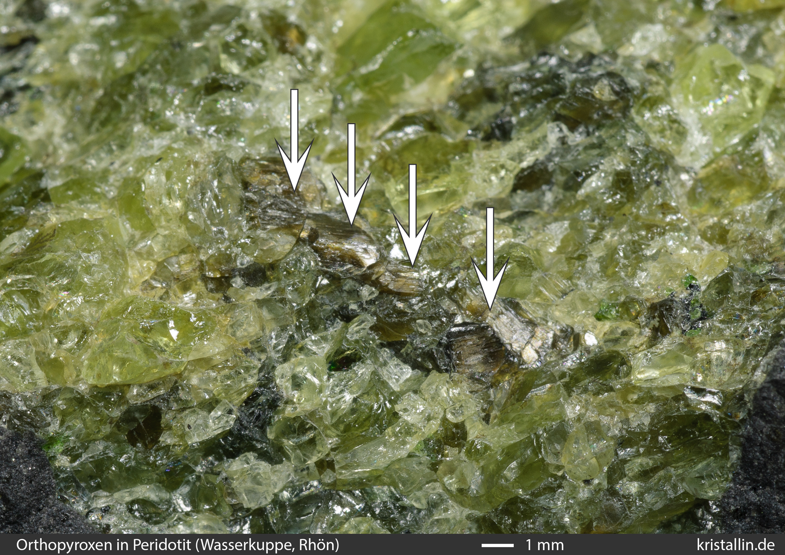 der sich der glänzende Orthopyroxen in der Bildmitte schön abhebt (Pfeile).