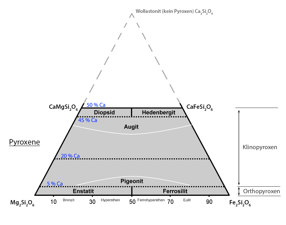 Zusammensetzung wichtiger Pyroxene geht aus dem Pyroxen-Trapez hier hervor.