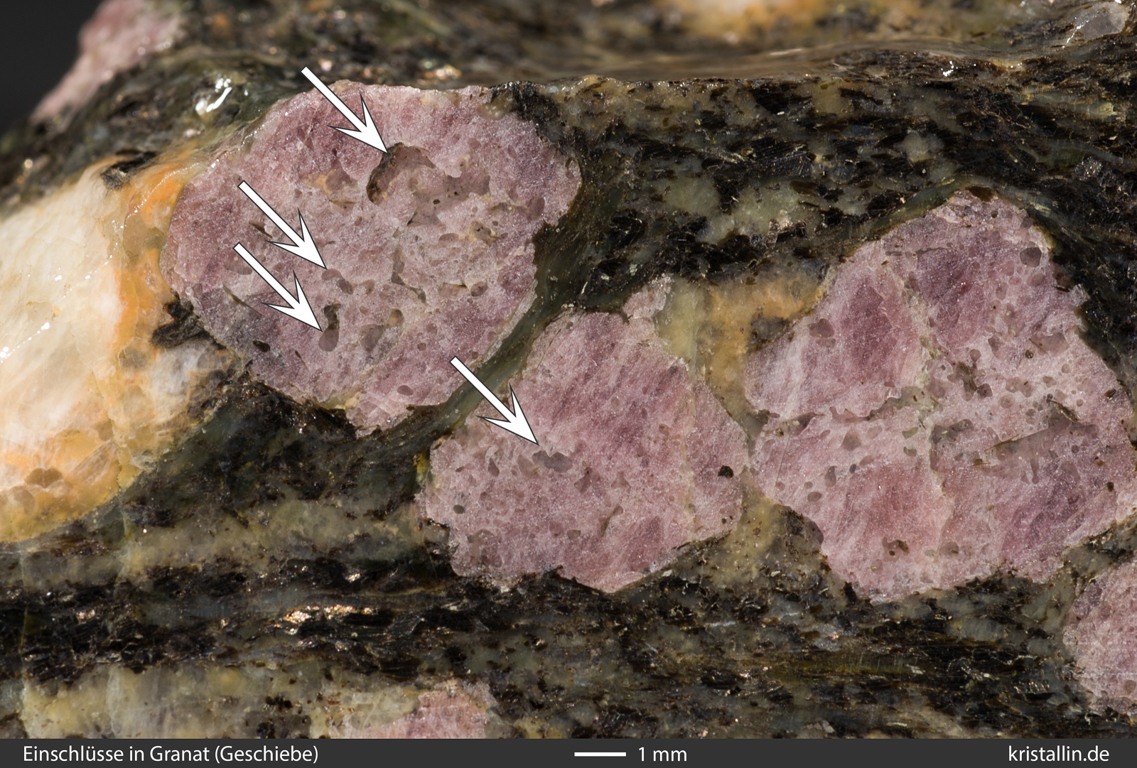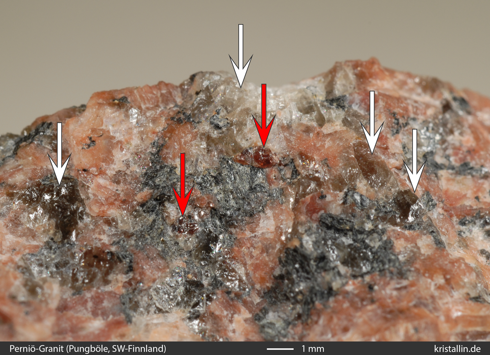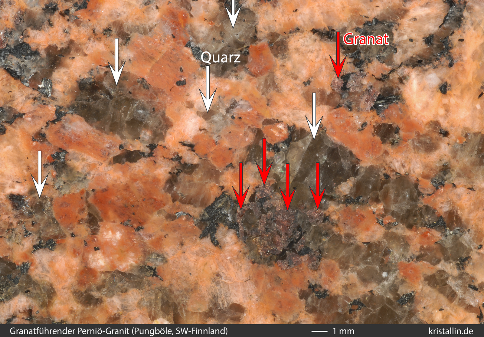 (Weiße Pfeile zeigen auf Quarz, rote auf Granat. Das fleischfarbene Mineral