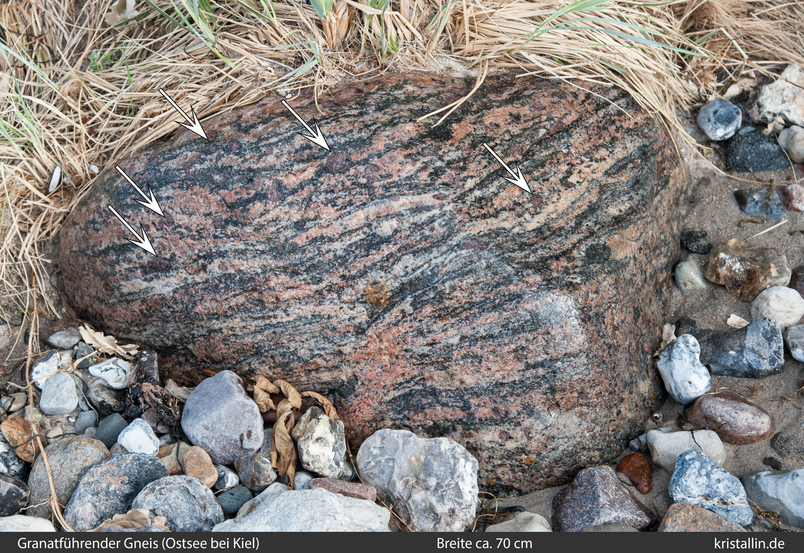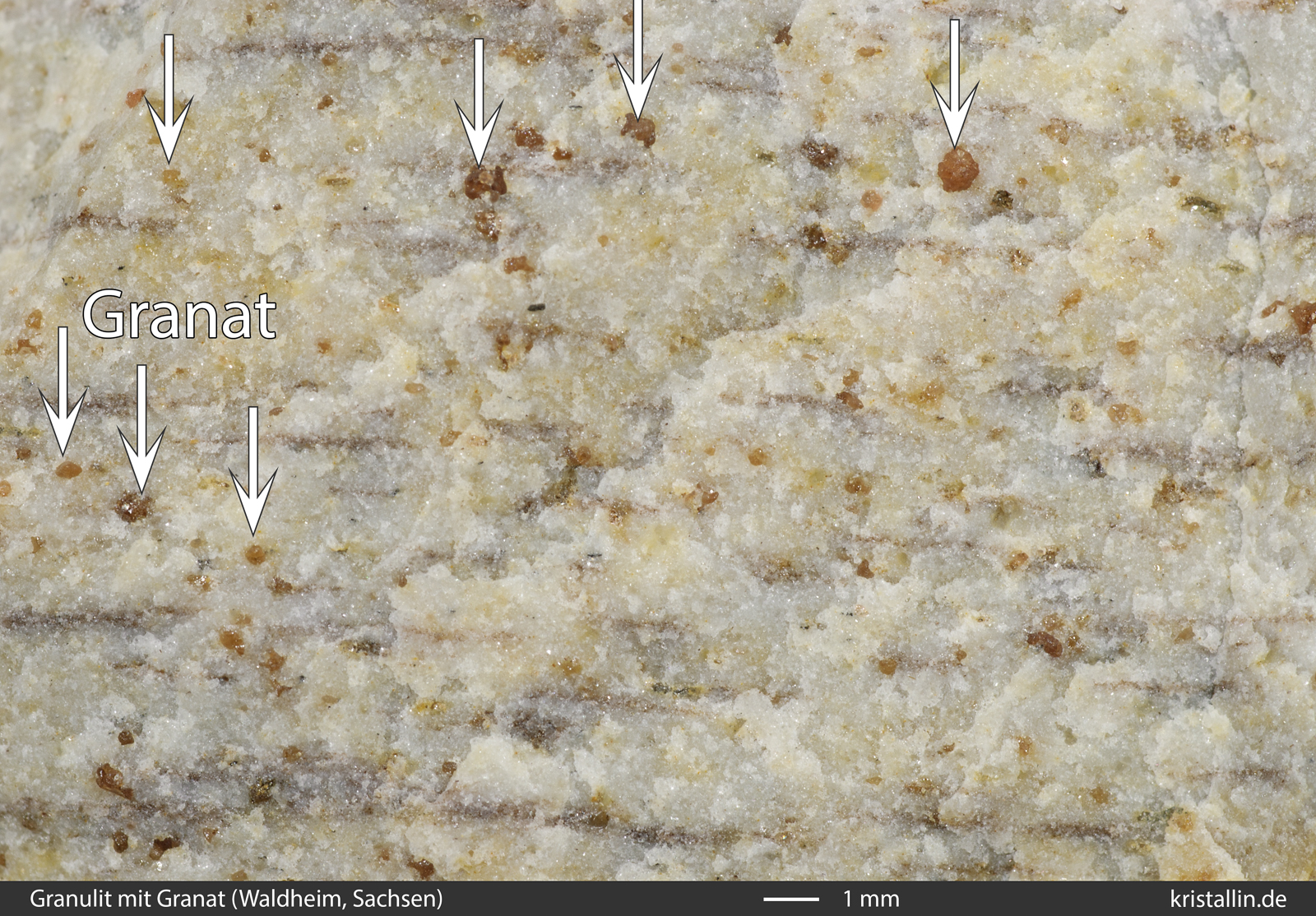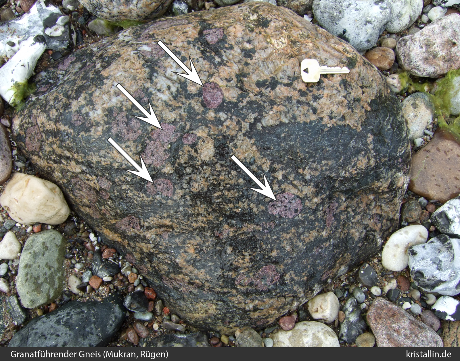 (Weiße Pfeile zeigen auf Quarz, rote auf Granat. Das fleischfarbene Mineral