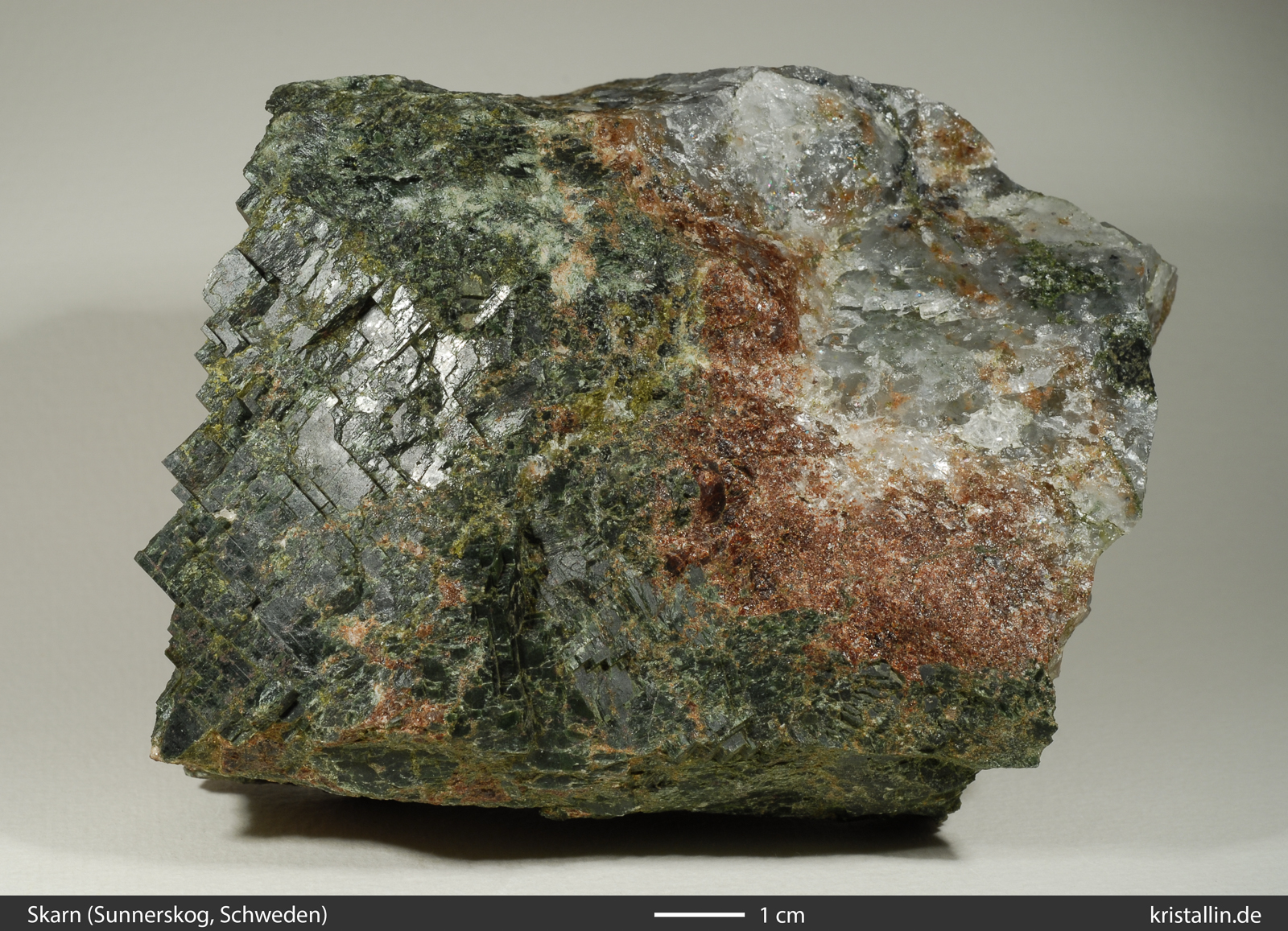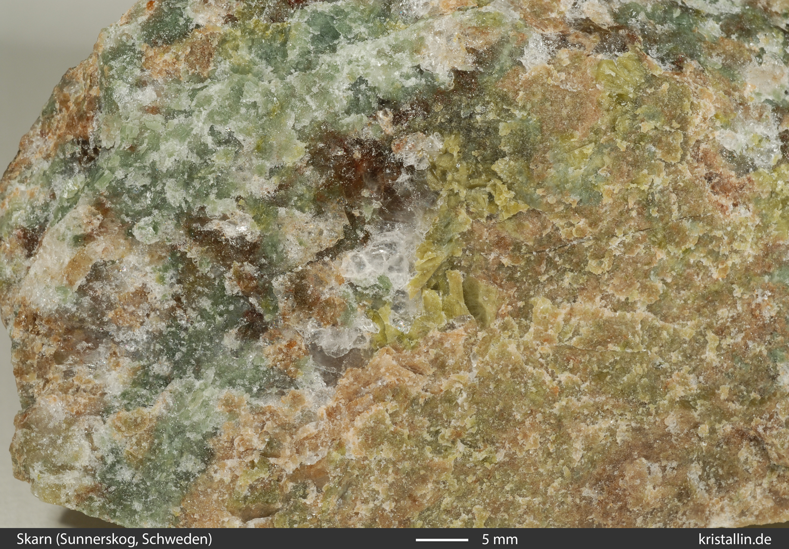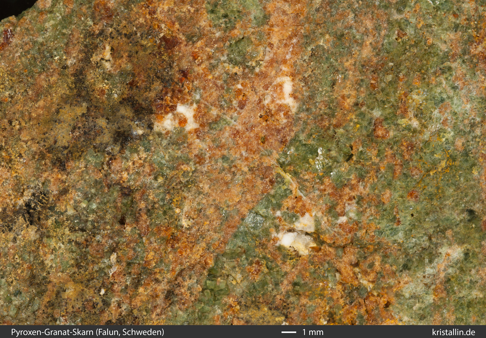 grünen Pyroxen und dunkelbraunen Granat (Mitte, oben). Typisch für Skarne