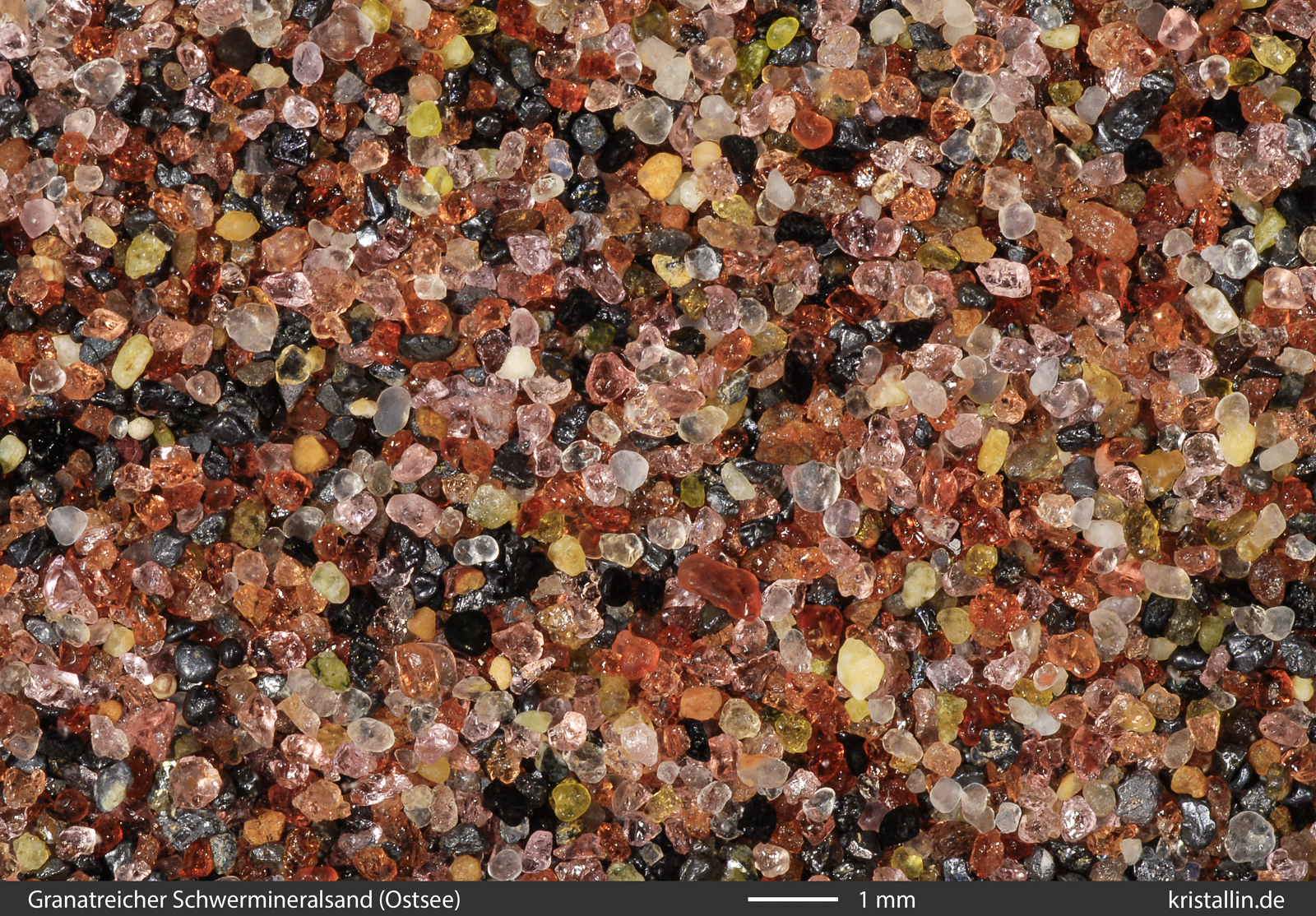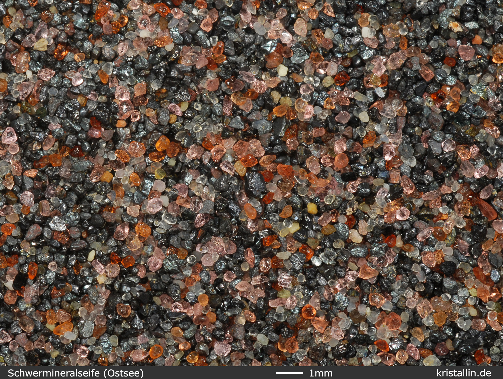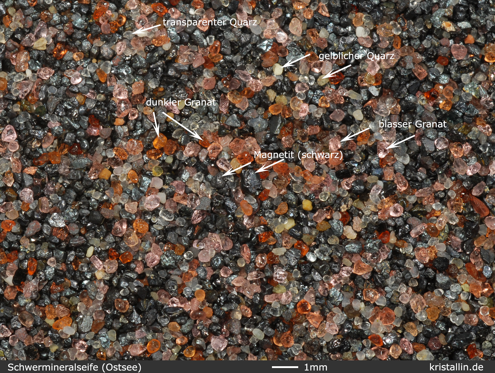 ist Granat, der zusammen mit schwarzem Magnetit dunkle Sande bildet. Solche