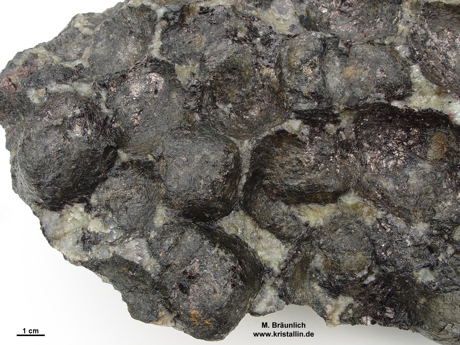 Bronzefarbener Biotit hüllt viele der Kugeln auf der Außenseite ein.