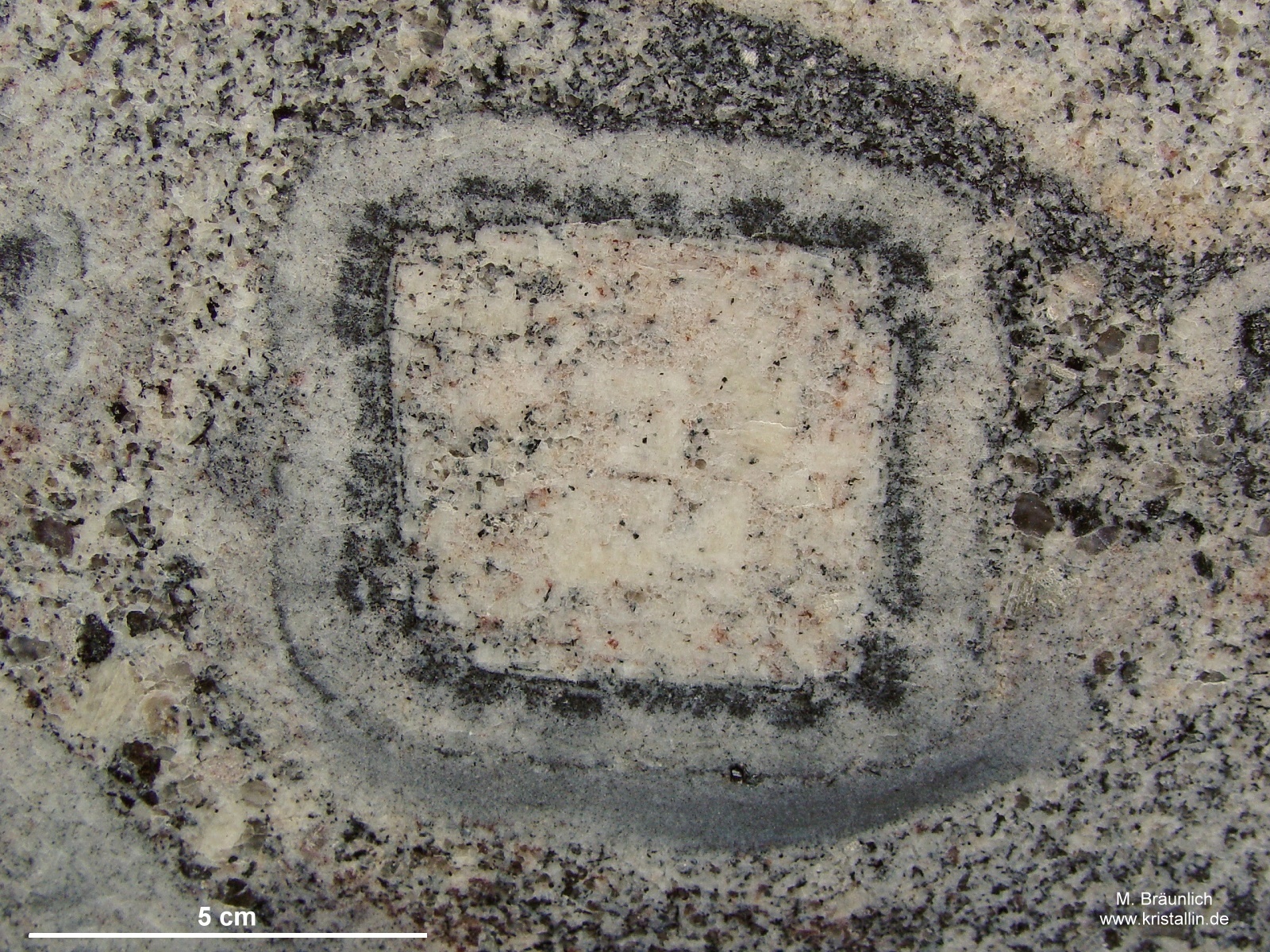 Alkalifeldspat als Kristallisationskeim. Um ihn herum sehen wir eine mehrere Zentimeter