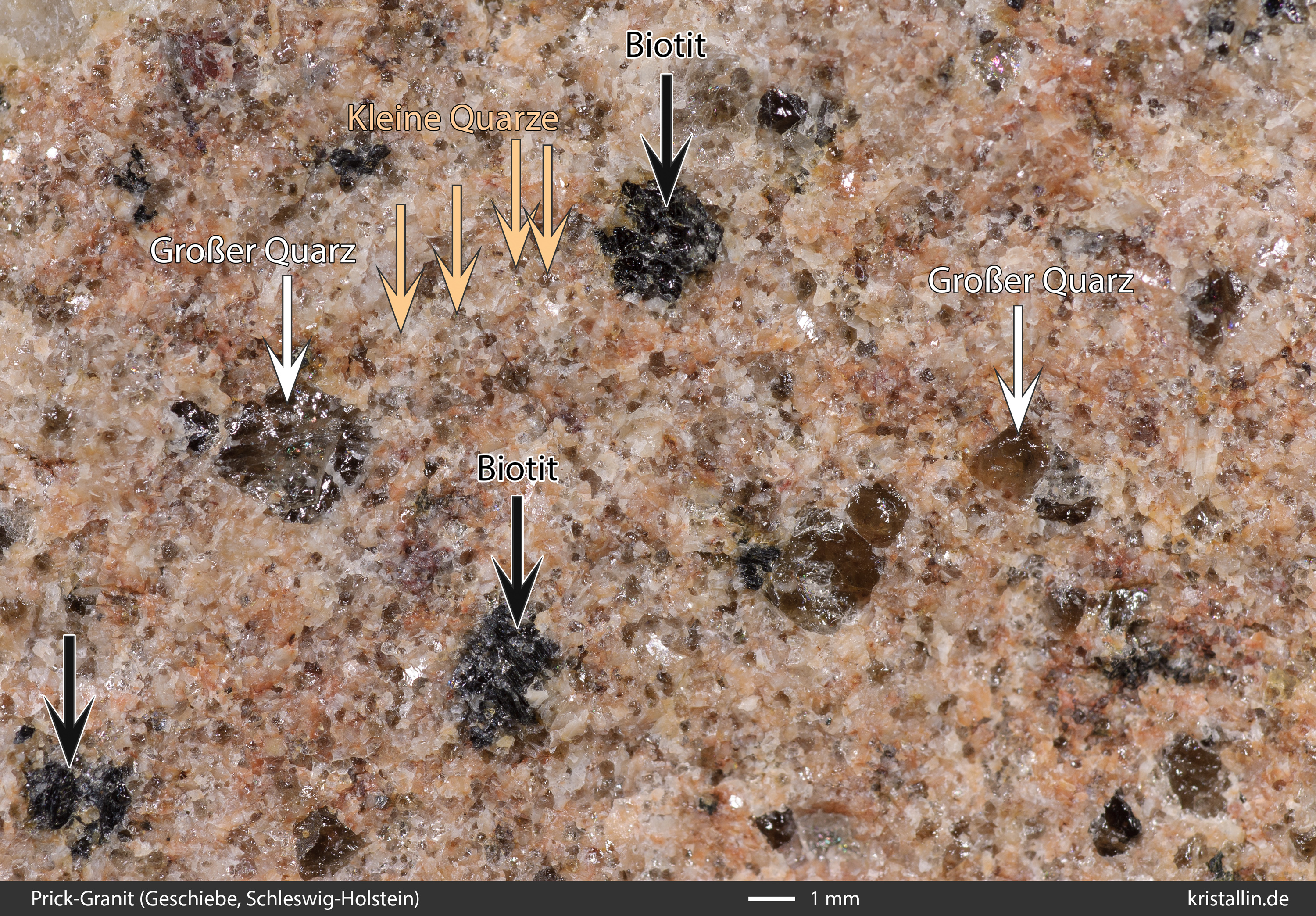Wegen des gleichkörnigen Gefüges kann die Grundmasse eines Prick-Granits auf den ersten Blick an einen Sandstein erinnern. Aber damit haben diese magmatischen Gesteine natürlich nichts zu tun. Sie sind besondere Gefügevarianten der Rapakiwi-Granite und kommen nur in Skandinavien vor. Alle Prick-Granite, die man in Deutschland findet, stammen aus einem dieser Granitmassive und wurden in den Gletschern der Eiszeiten nach Süden transportiert.