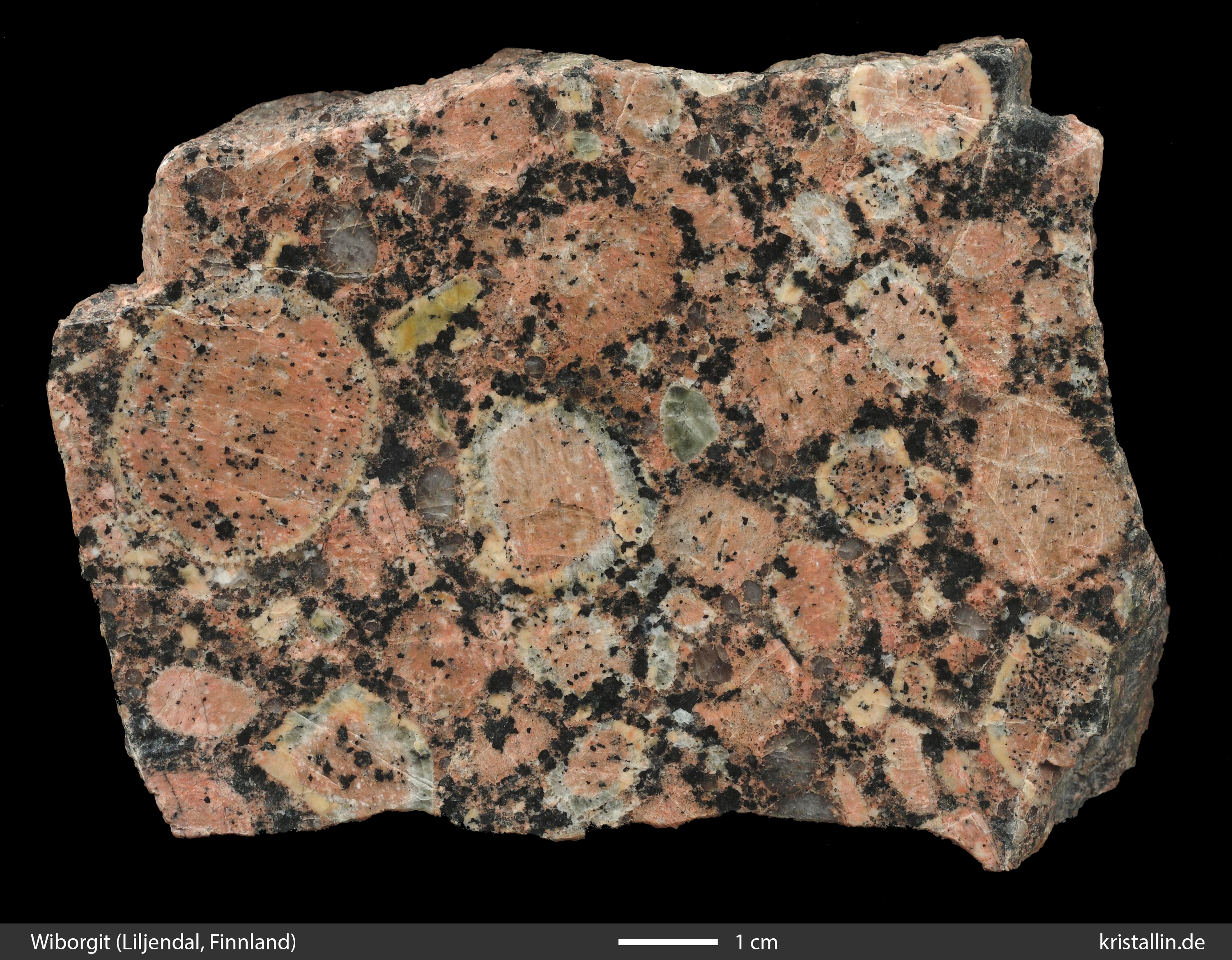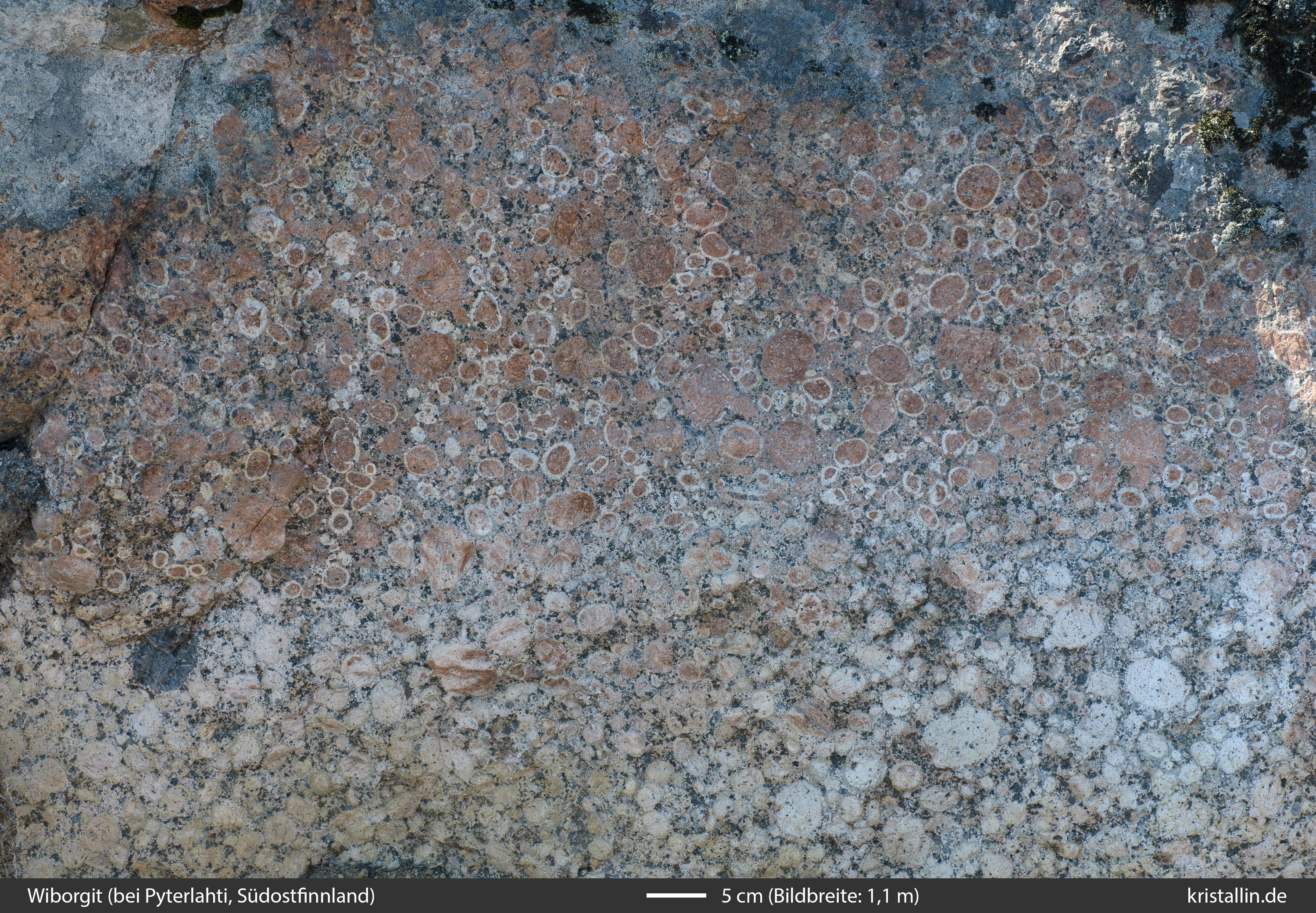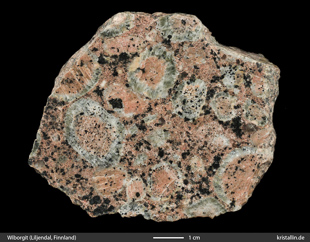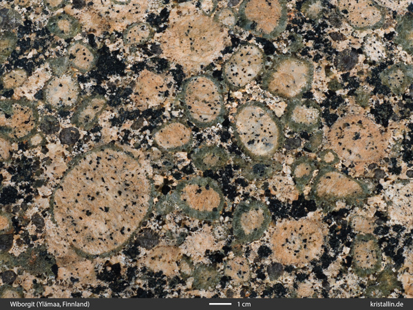 Ein Wiborgit ist ein Rapakiwi-Granit, dessen rundliche Feldspäte mehrheitlich einen äußeren Saum tragen. „Wiborgit“ beschreibt also das Aussehen eines Rapakiwis, nicht seine Herkunft. (Bilder zum Vergrößern anklicken.)