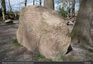 Bei Desum, in der Nähe von Vechta, gibt es einen alten Gerichtsplatz, dessen zentraler Stein so ein Wiborgit aus dem Wiborg-Pluton ist. An seiner Schmalseite sind die großen Ovoide mit ihrem hellen Plagioklassaum gut zu erkennen (Bild 9). Auch dieser Wiborgit enthält zwei Sorten von Quarz.