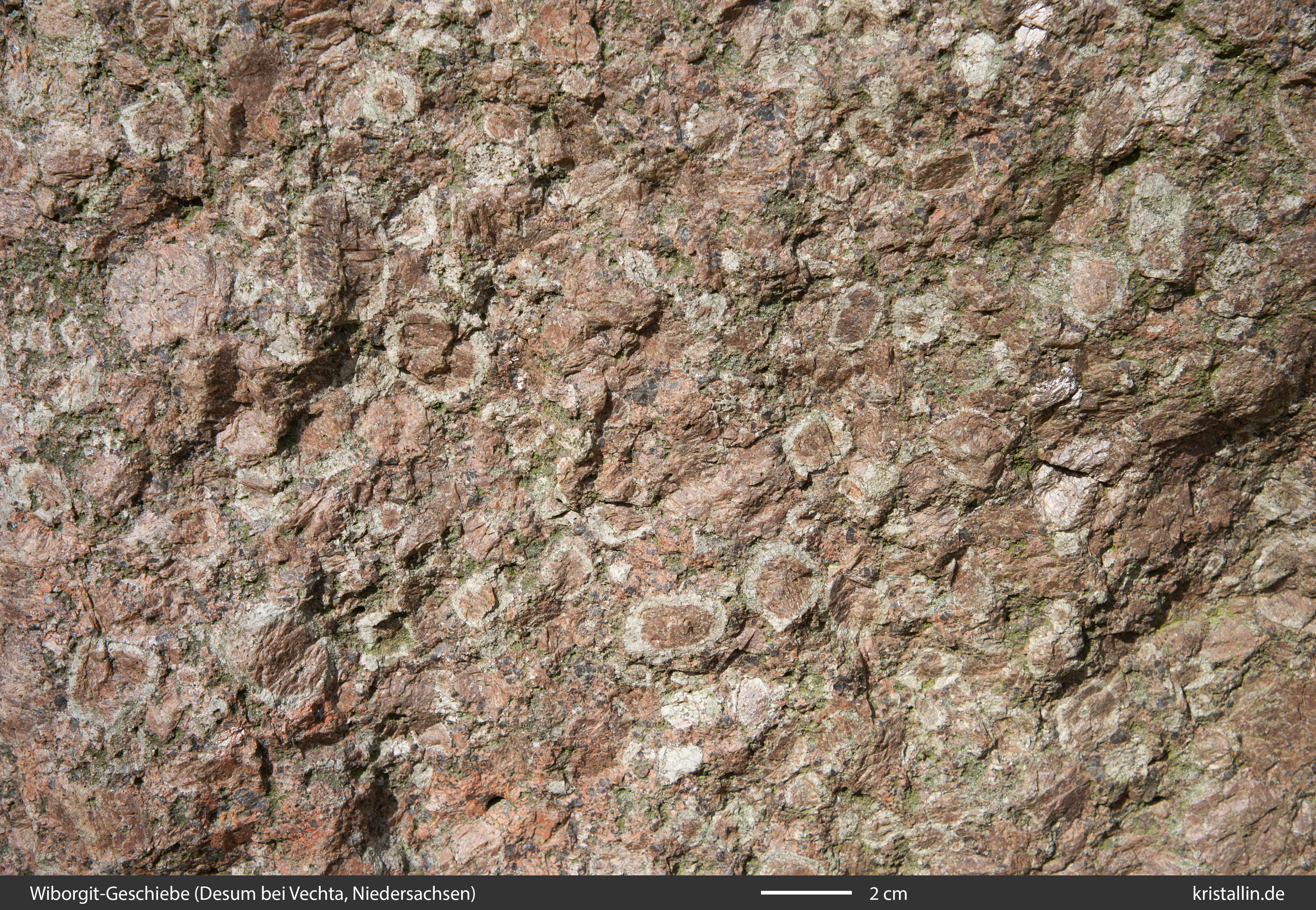 Wiborgite aus dem Wiborgpluton findet man in Norddeutschland nur sehr selten. Man erkennt sie an ihren zwei bis drei Zentimeter großen gesäumten Ovoiden. Meist sind diese Wiborgite braun.