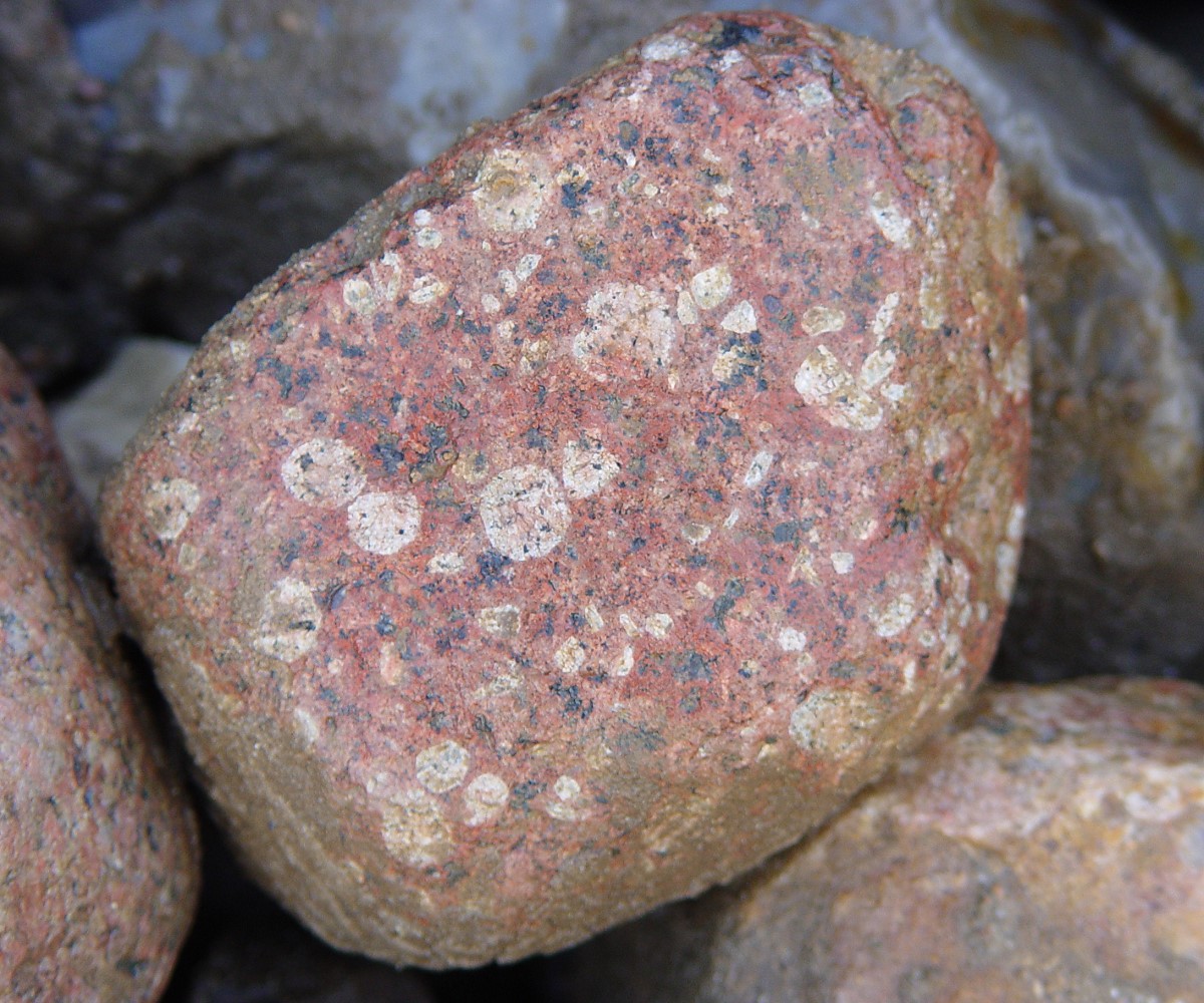 Unten: Ebenfalls in der Kiesgrube Schwissel. Der Stein ist schmutzig und naß. Die Ovoide springen nicht mehr ins Auge, sind aber noch deutlich zu erkennen. Das Gestein ist deutlich brauner als oben. Der Farbton kann in weiten Grenzen schwanken, enthält aber immer Rot oder Braun. Das entscheidende Merkmal sind die Ovoide und die graphischen Verwachsungen in der Grundmasse. Für solche Geschiebe ist zur Bestimmung eine Flasche mit Wasser und eine gute Lupe unerläßlich. | ||||||||||||||||||||||||||||||||||||||||||||||||||||||||||||||||||||||||||||||||||||||||||||||||||||||||||||||||||||||||||||||||