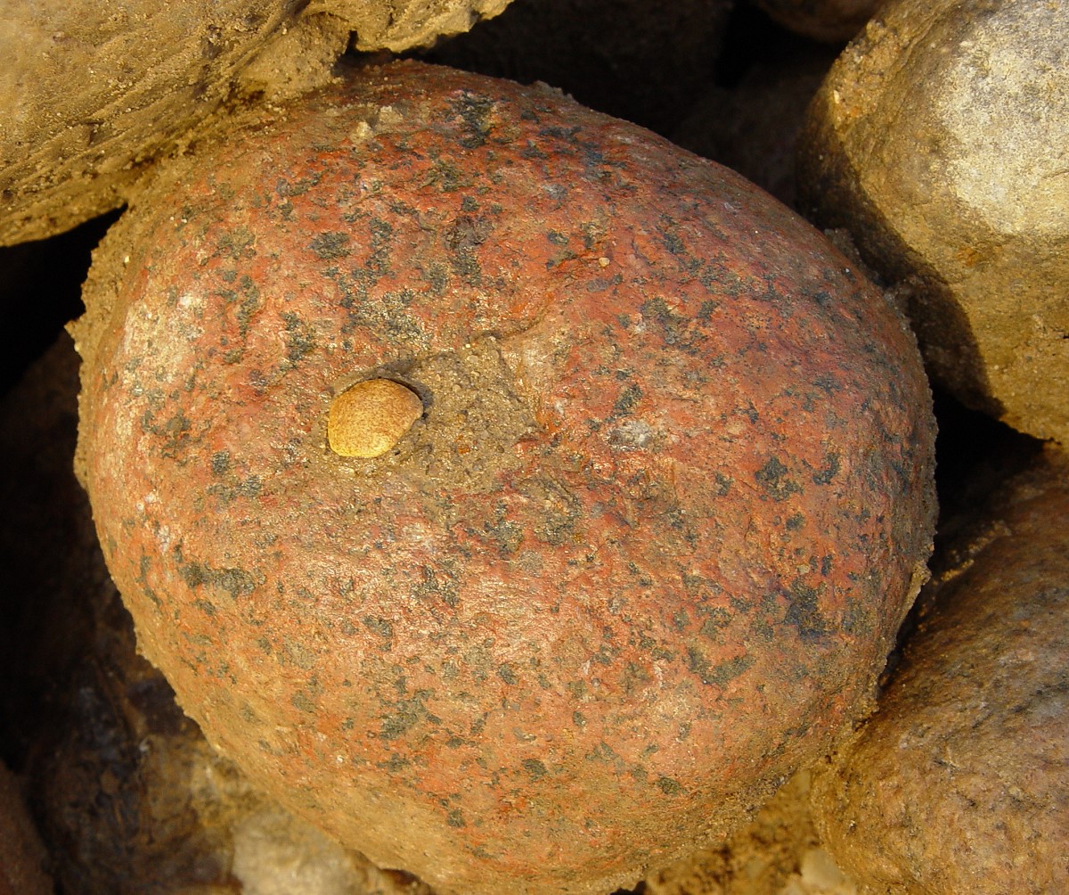 Unten: Nasses Geschiebe, Kiesgrube Schwissel, Schleswig-Holstein. Die Ovoide sind als Ganze angewittert und hell. Das Gestein zu erkennen ist keine Kunst. | ||||||||||||||||||||||||||||||||||||||||||||||||||||||||||||||||||||||||||||||||||||||||||||||||||||||||||||||||||||||||||||||||